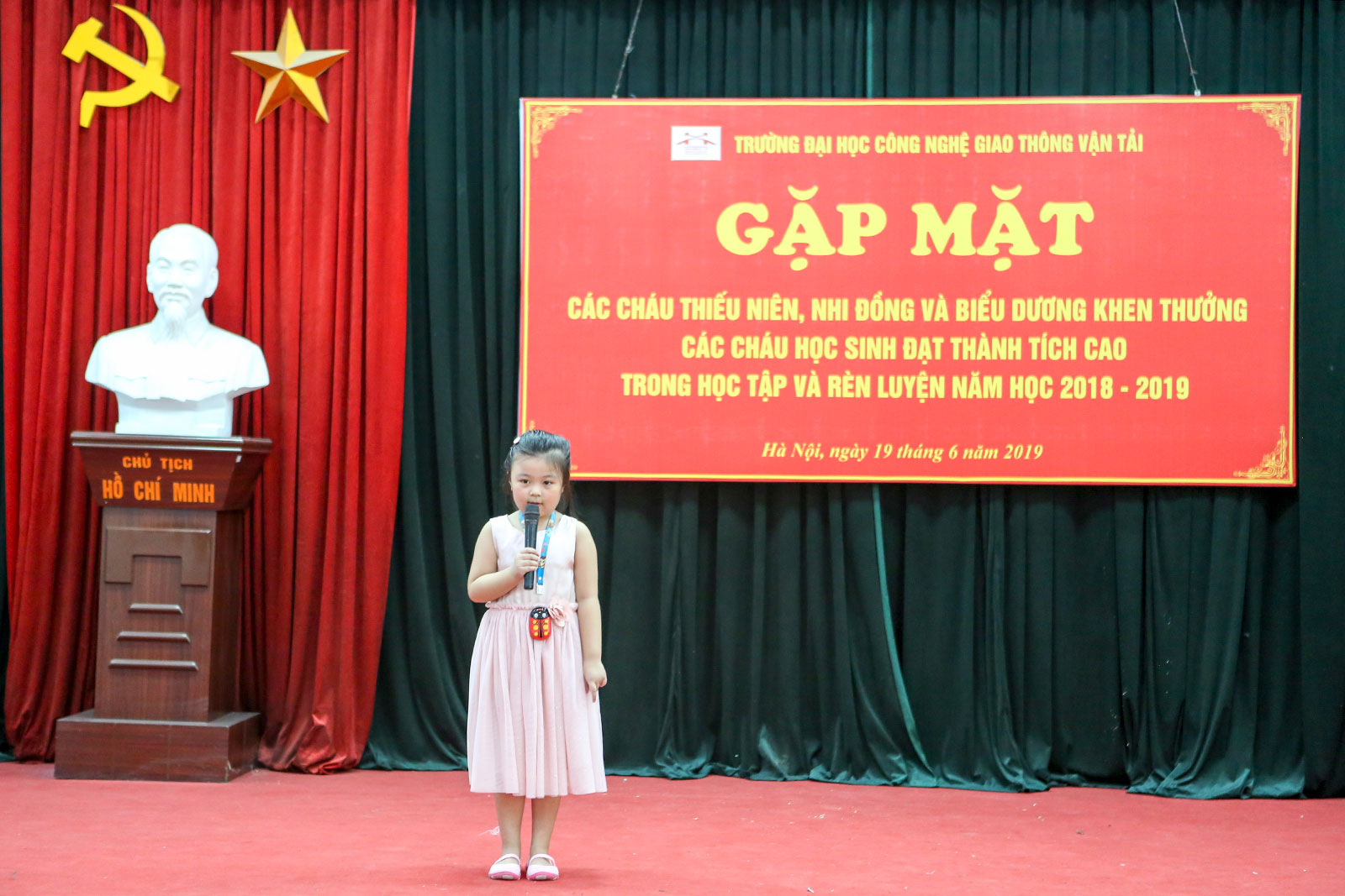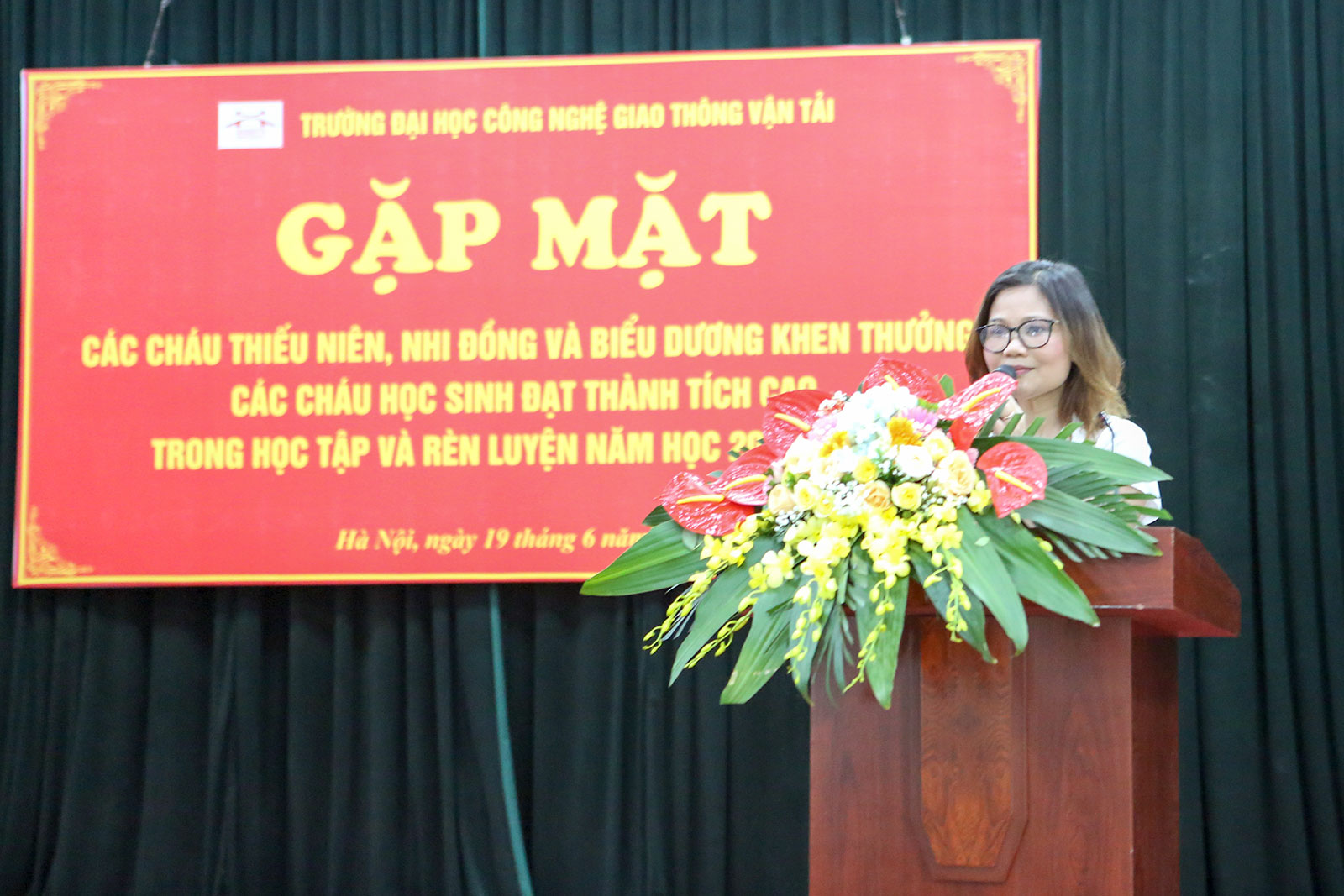 Đại diện Ban Nữ công Trường Đại học Công nghệ GTVT, bà Cao Thị Thu Nga - Trưởng ban Nữ công Trường nhiệt liệt biểu dương và chúc mừng các cháu học sinh đạt thành tích xuất sắc trong năm học 2018 - 2019; động viên, khuyến khích các cháu tiếp tục phát huy những thành tích đã đạt được, cố gắng nỗ lực hơn nữa để giành nhiều thành tích cao hơn. Bà Cao Thu Nga hy vọng các bậc phụ huynh không ngừng quan tâm dạy dỗ con em mình và tiếp tục đồng hành cùng các cháu trong các phong trào phấn đấu học tập, rèn luyện trong năm học tới.