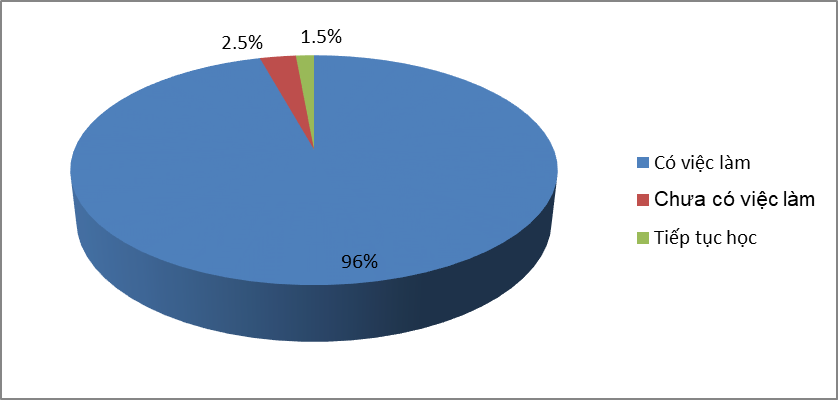 Trong Bảng số liệu trên có 96% có thông tin phản hồi đã có việc làm; 1.5% SVTN tiếp tục đi học nâng cao trình độ rồi mới có ý định tìm việc làm; 4% SVTN chưa có việc làm. Như vậy tỷ lệ SVTN có việc làm là: 96%
