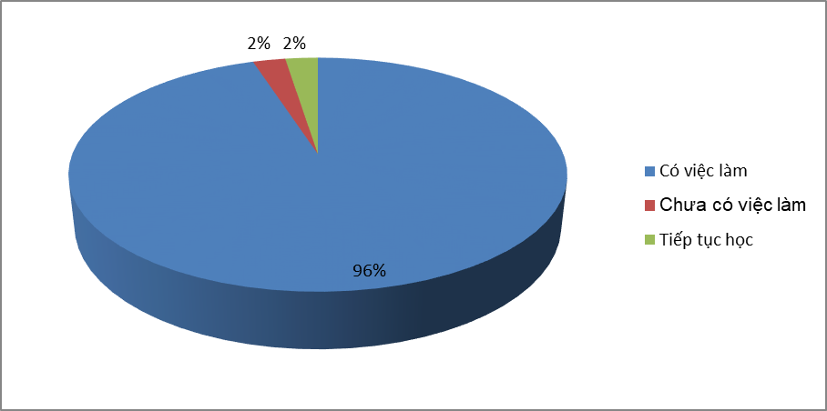 Trong Bảng số liệu trên có 96% có thông tin phản hồi đã có việc làm; 2% SVTN tiếp tục đi học nâng cao trình độ rồi mới có ý định tìm việc làm; 2% sinh viên TN chưa có việc làm. Như vậy tỷ lệ SVTN có việc làm hoặc đang học lên cao là: 98%
