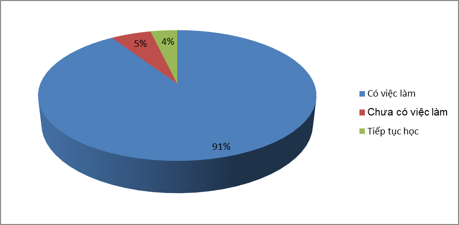 Trong Bảng số liệu trên có 91% có thông tin phản hồi đã có việc làm; 4% SVTN tiếp tục đi học nâng cao trình độ rồi mới có ý định tìm việc làm; 5% sinh viên TN chưa có việc làm. Như vậy tỷ lệ SVTN có việc làm là: 95%