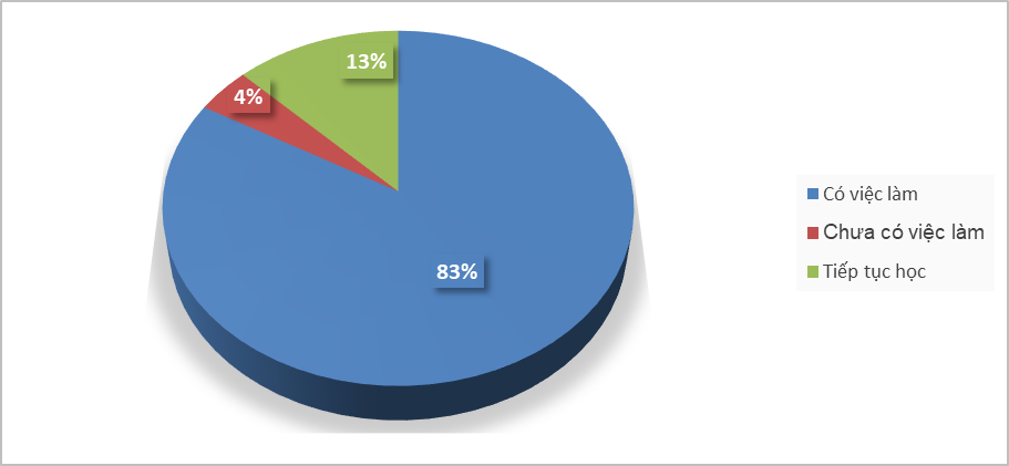 Trong Bảng số liệu trên có 83% có thông tin phản hồi đã có việc làm; 13% SVTN tiếp tục đi học nâng cao trình độ rồi mới có ý định tìm việc làm; 4% sinh viên TN chưa có việc làm. Như vậy tỷ lệ SVTN có việc làm là: 96%