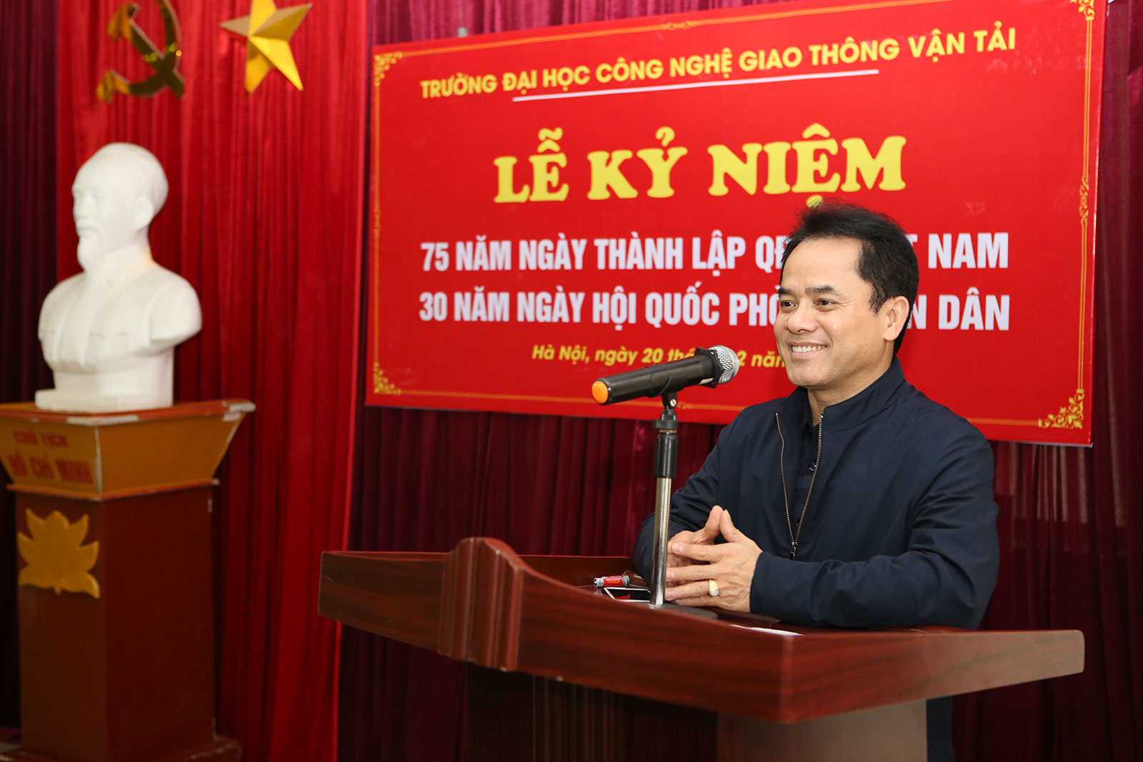 Thay mặt Ban Giám hiệu Nhà trường, PGS.TS. Vũ Ngọc Khiêm - Phó Bí thư Thường trực Đảng ủy, Phó Hiệu trưởng, Chỉ huy trưởng BCHQS Trường đã thông tin một số nét chính về tình hình, kết quả đạt được trong thời gian qua và phương hướng hoạt động của Trường Đại học Công nghệ GTVT, đồng thời ghi nhận và tri ân những đóng góp của các thế hệ cán bộ, giảng viên là các cựu quân nhân trong sự nghiệp phát triển chung của đất nước và Nhà trường. Phó Hiệu trưởng Vũ Ngọc Khiêm bày tỏ mong muốn các đồng chí giữ sức khỏe, tiếp tục phát huy bản chất bộ đội cụ Hồ, đóng góp công sức và trí tuệ xây dựng đất nước và Nhà trường luôn vững mạnh toàn diện.