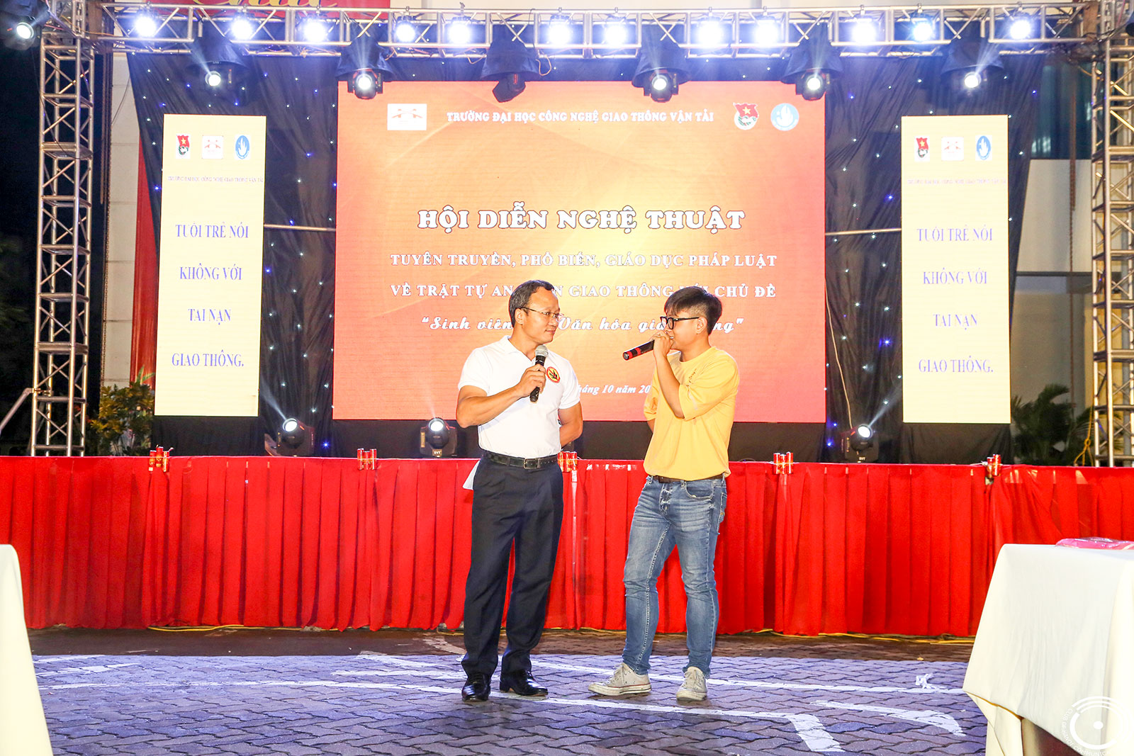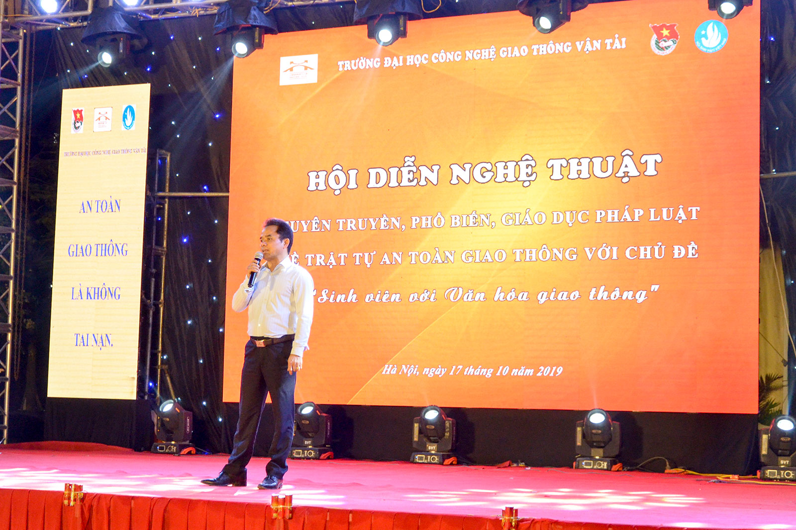 Phát biểu khai mạc và chỉ đạo chương trình, PGS.TS. Vũ Ngọc Khiêm - Phó Bí thư Đảng ủy, Phó Hiệu trưởng Nhà trường khẳng định Trường Đại học Công nghệ GTVT là địa chỉ tin cậy, uy tín trong công tác tuyên truyền, phổ biến pháp luật giáo dục về an toàn giao thông; hoạt động tuyên truyền, giáo dục pháp luật về an toàn giao thông cho thanh niên, sinh viên Nhà trường là hoạt động thường niên. Hội diễn nghệ thuật với chủ đề “Sinh viên với Văn hóa giao thông” ngày hôm nay là một trong những chương trình sân khấu hóa với các tiết mục văn nghệ đặc sắc do thanh niên, sinh viên Nhà trường và các trường bạn trực tiếp tham gia biểu diễn với nội dung mang đậm ý nghĩa giáo dục truyền thống văn hóa, đề cao tinh thần yêu quê hương đất nước, nhiệt huyết của tuổi trẻ; thông qua chương trình sẽ là động lực, sức mạnh lan tỏa, truyền cảm hứng cho thanh niên, sinh viên. Hội diễn nghệ thuật ngày hôm nay còn là lời chào mừng đối với các bạn tân sinh viên khóa 70 của Nhà trường. Cuối cùng, PGS.TS. Vũ Ngọc Khiêm thay mặt tập thể sư phạm Nhà trường chúc các bạn sinh viên K70 và các bạn sinh viên trong toàn trường học tập, rèn luyện thật tốt; thực hiện nghiêm túc luật khi tham gia giao thông, xứng đáng là sinh viên của Trường Địa học Công nghệ GTVT.