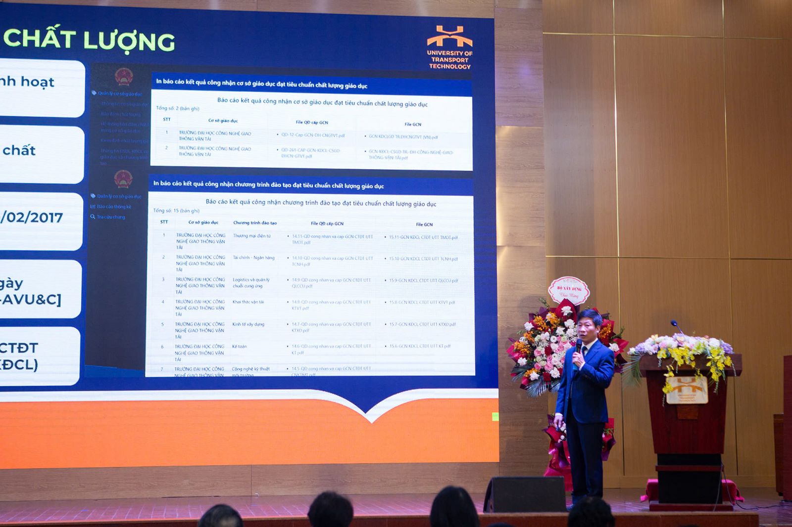 Thay mặt Hội đồng Tự đánh giá, PGS.TS. Nguyễn Hoàng Long - Hiệu trưởng, Chủ tịch Hội đồng TĐG đã giới thiệu tổng quan về Trường Đại học Công nghệ GTVT, quá trình tự đánh giá và những kết quả đạt được. Trong thời gian vừa qua, UTT đã ghi dấu nhiều thành tựu nổi bật trong đào tạo, nghiên cứu khoa học, đổi mới sáng tạo, hợp tác quốc tế cũng như phát triển cơ sở vật chất. Trong đó, nổi bật là tháng 02/2025, Journal of Science and Transport Technology (JSTT) chính thức được chấp nhận vào cơ sở dữ liệu Scopus; tháng 08/2025, Trường ký kết hợp tác với Đại học Giao thông Quốc gia Hàn Quốc (KNUT) tại Diễn đàn Kinh tế Hàn Quốc - Việt Nam dưới sự chứng kiến của lãnh đạo cấp cao hai nước. Đặc biệt, Bộ GD&ĐT đã lựa chọn UTT là một trong 13 cơ sở đào tạo đại học dẫn dắt Trung tâm đào tạo xuất sắc, tài năng về Công nghệ giao thông và Hạ tầng tiên tiến, thông minh.