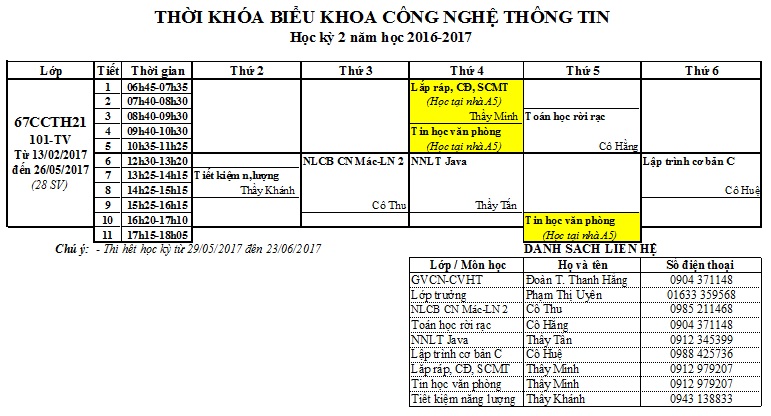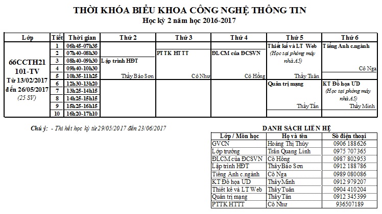 Thời khóa biểu học kỳ 2 năm học 2016-2017 hệ Cao đẳng