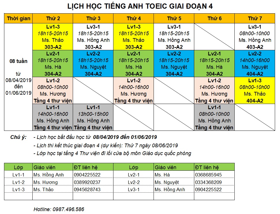 Khoa Công nghệ thông tin thông báo LỊCH HỌC và DANH SÁCH các lớp trình độ TOEIC giai đoạn 4 (tháng 4/2019). Cụ thể như sau:
