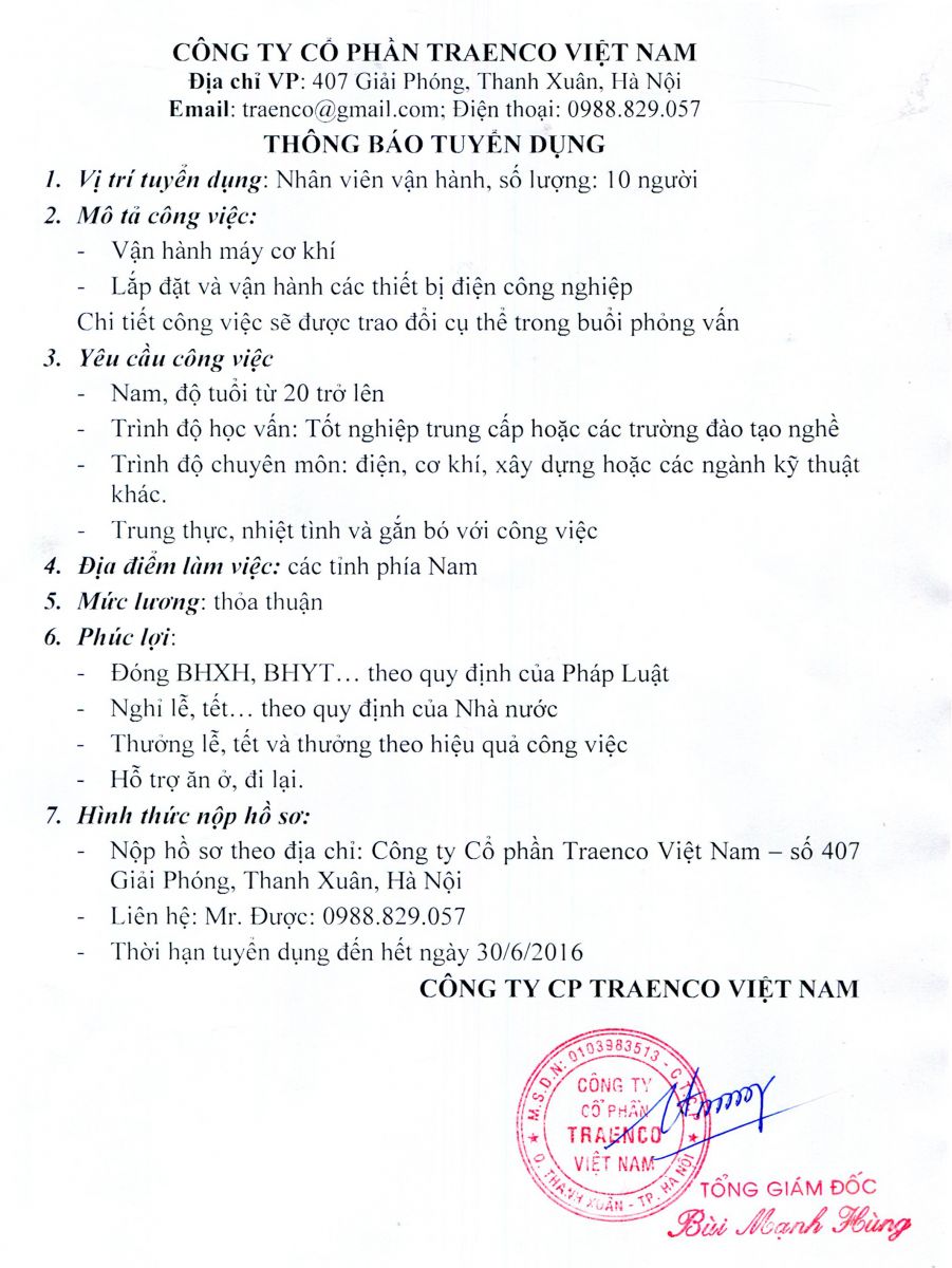 Công ty Cổ phần Traenco Việt Nam tuyển dụng