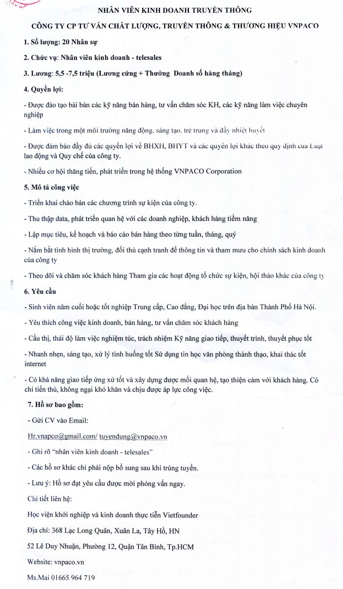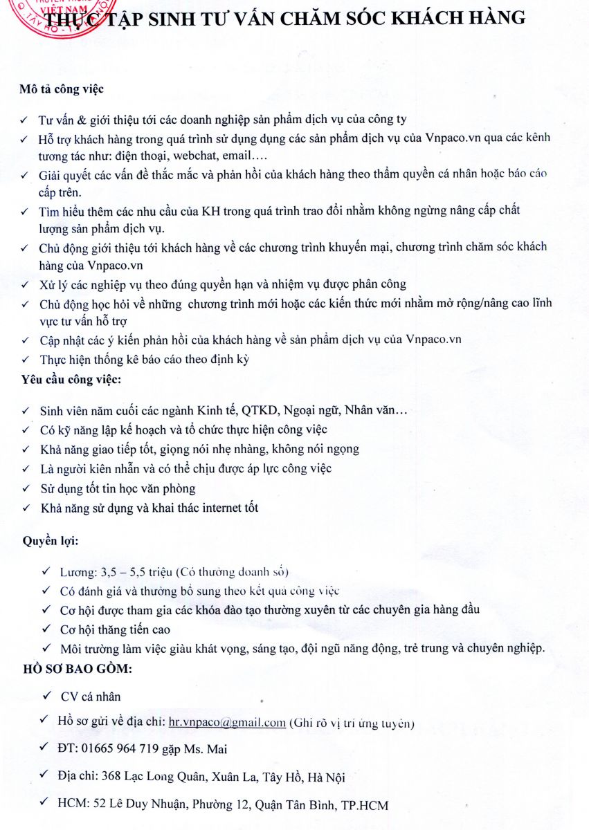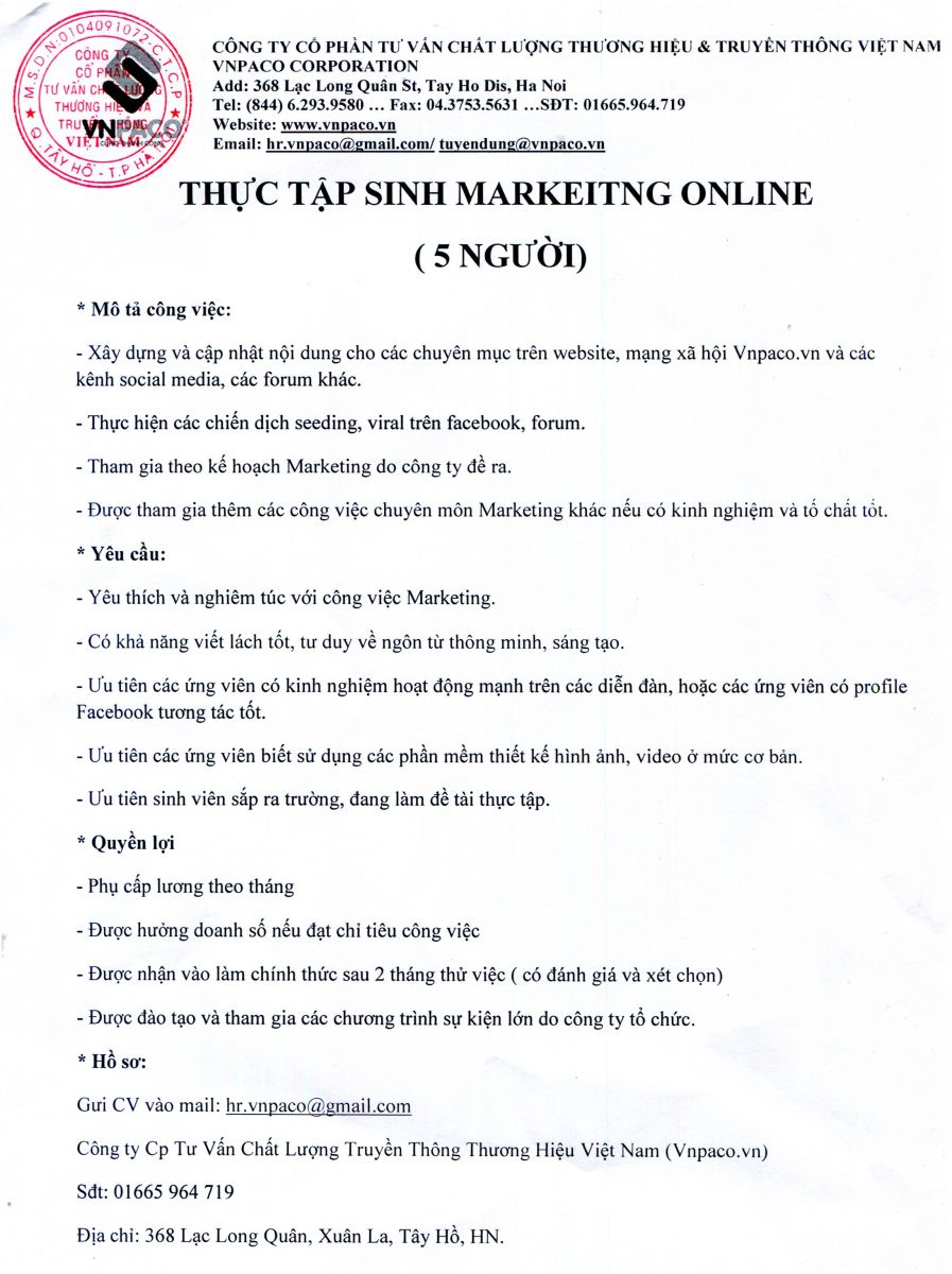 *Các vị trí tuyển dụng: - Thực tập sinh Marketing Online. - Nhân viên kinh doanh truyền thông. - Thực tập sinh tư vấn chăm sóc khách hàng. - Chuyên viên tuyển dụng.
