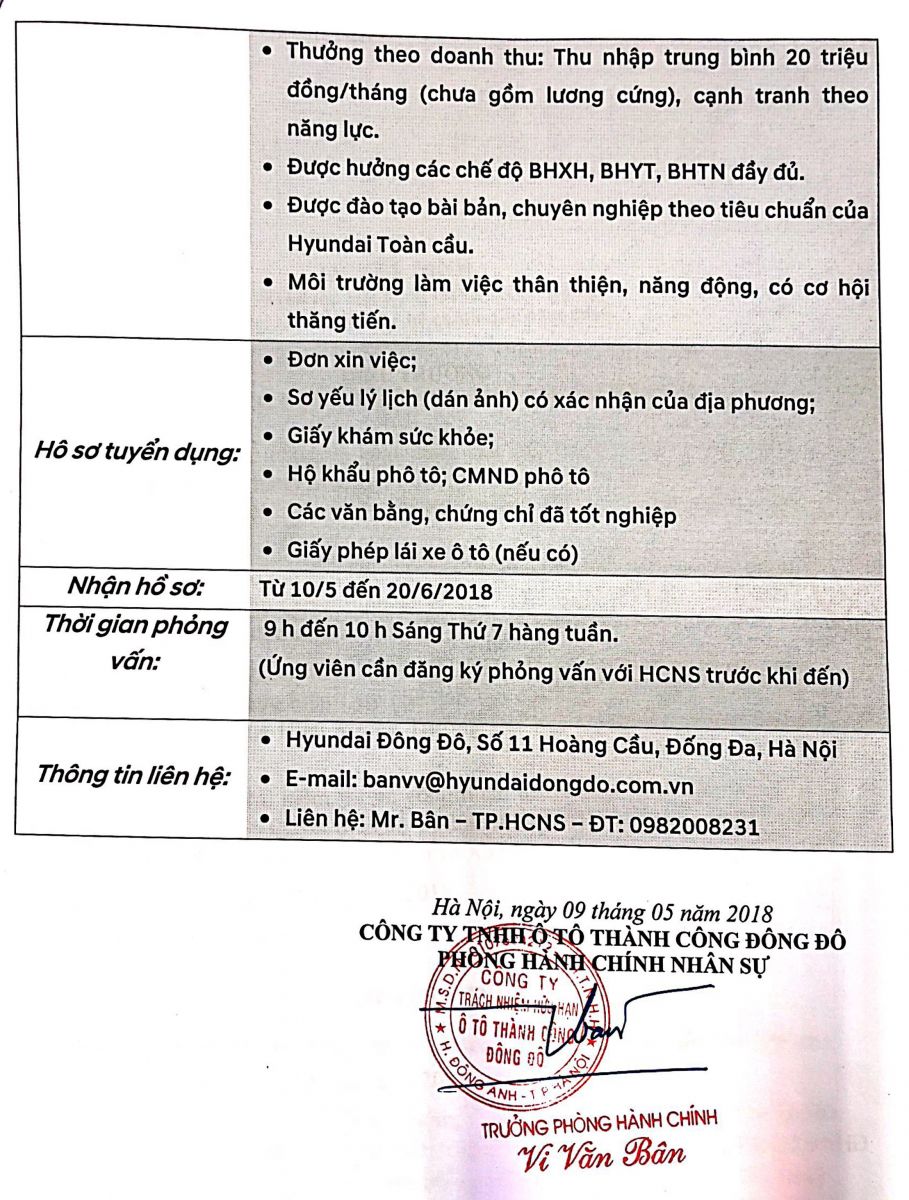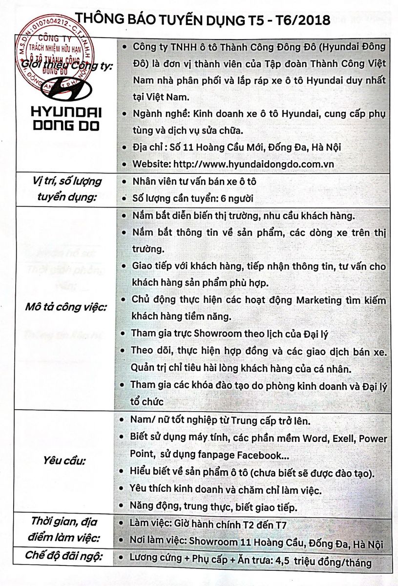 Công ty TNHH Ô tô Thành Công Đông Đô tuyển dụng