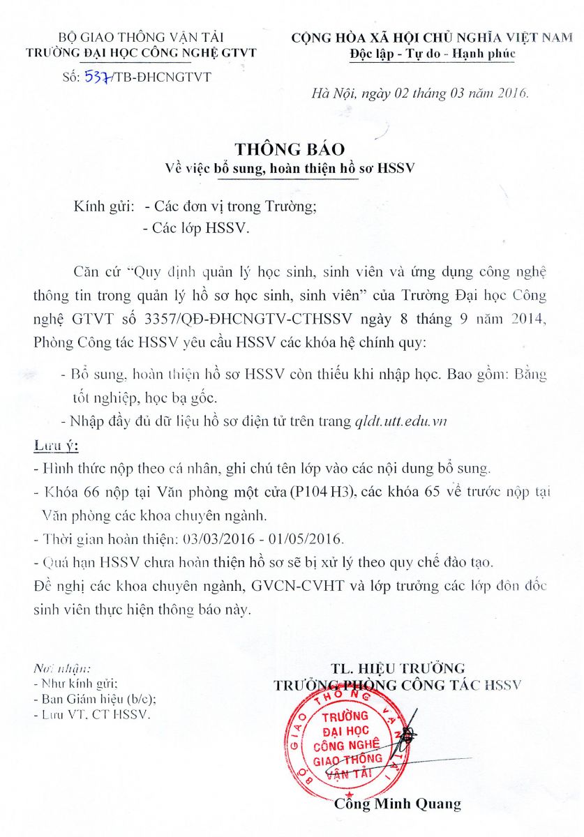 Thông báo về việc bổ sung, hoàn thiện hồ sơ HSSV