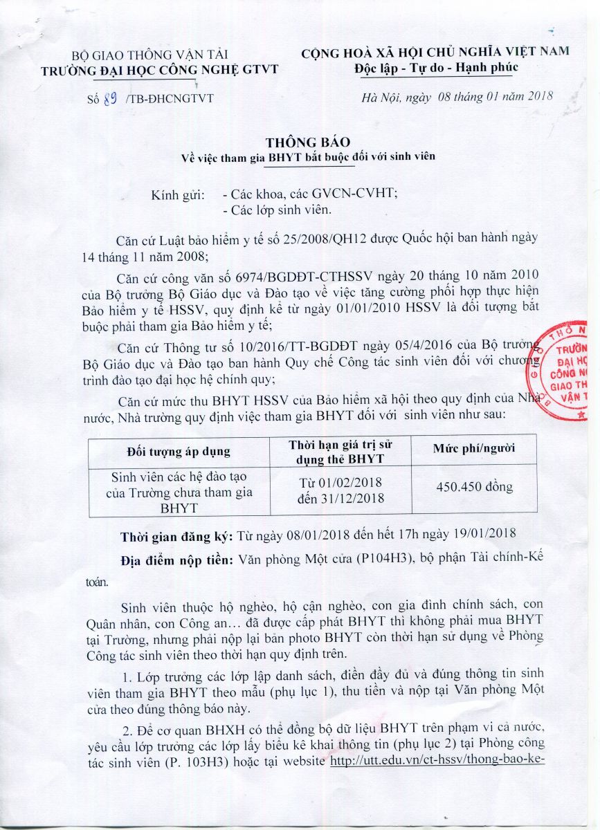 Thông báo về việc tham gia BHYT bắt buộc đối với sinh viên đợt 1 năm 2018