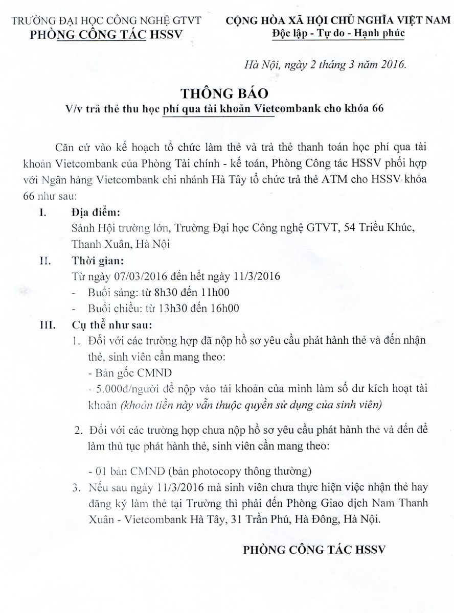 Thông báo về việc trả thẻ thu học phí ATM của Vietcombank cho khóa 66