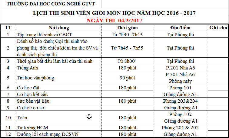 Thông báo Lịch thi và Danh sách thi sinh viên giỏi môn học năm học 2016 - 2017