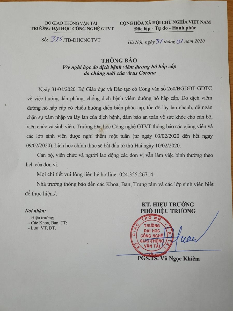 Thông báo về việc nghỉ học do dịch bệnh viêm đường hô hấp cấp do chủng mới của virus Corona