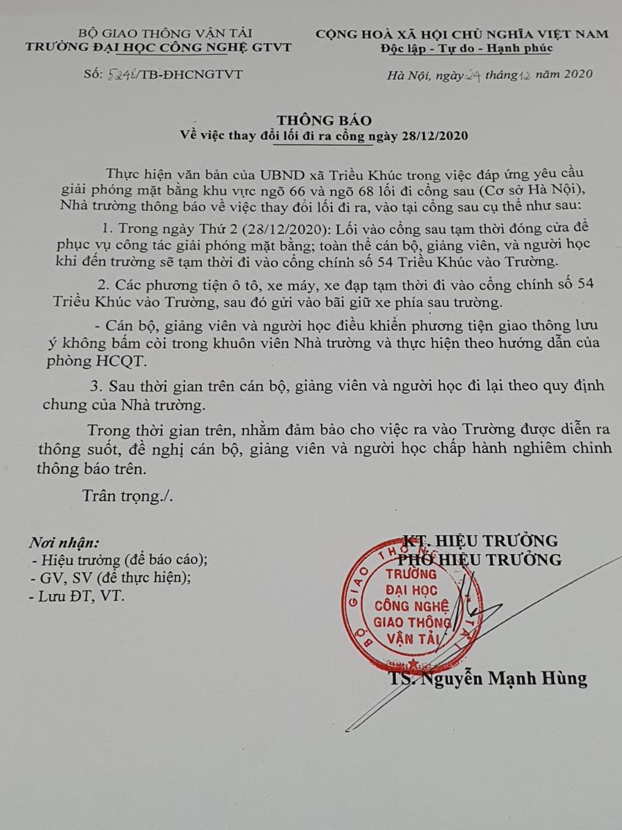 THÔNG BÁO VỀ VIỆC THAY ĐỔI VỀ VIỆC THAY ĐỔI LỐI ĐI RA CỔNG NGÀY 28/12/2020
