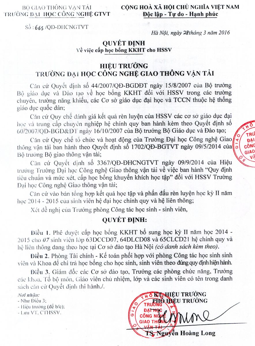 DANH SÁCH SINH VIÊN ĐẠT HỌC BỔNG KKHT (BỔ SUNG) HỌC KỲ II NĂM HỌC 2014 - 2015 (Ban hành kèm theo Quyết định số 663 /QĐ - ĐHCNGTVT ngày 28 tháng 3 năm 2016 của Hiệu trưởng Trường Đại học Công nghệ Giao thông vận tải)