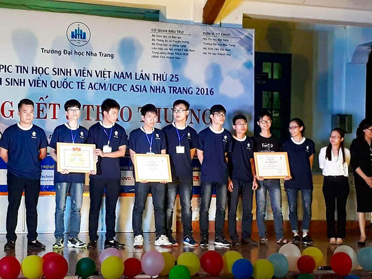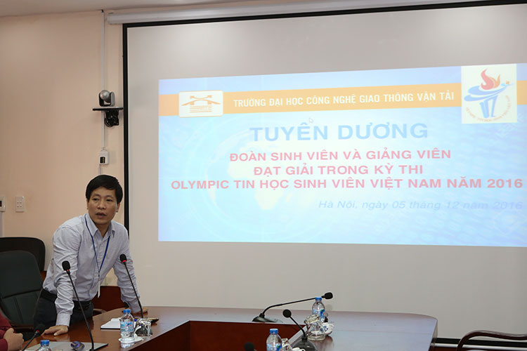 Ngày 05/12/2016, Trường Đại học Công nghệ Giao thông vận tải tổ chức Lễ Tuyên dương khen thưởng sinh viên đạt thành tích tại Kỳ thi Olympic Tin học Sinh viên Việt Nam lần thứ 25 - Kỳ thi Lập trình sinh viên quốc tế ACM/ICPC ASIA Nha Trang 2016. Đội tuyển dự thi Trường Đại học Công nghệ GTVT lên nhận giải (ngoài cùng bên phải) Đến với kỳ thi Olympic Tin học sinh viên Việt Nam năm nay, đội tuyển Trường Đại học Công nghệ GTVT gồm 3 sinh viên Nguyễn Đức Ngọc Anh - lớp 64DCTH01 - Đội trưởng, Nguyễn Phúc Hoà - lớp 64DCTH03, Tạ Thị Minh Châu - lớp 64DCTH03. Đội tuyển tham dự khối thi Phần mềm nguồn mở với sự hướng dẫn và chỉ đạo của Thầy giáo Nguyễn Tùng Dương đã đoạt giải 3 toàn đoàn tại khối thi này. Đây là lần đầu tiên Trường Đại học Công nghệ GTVT có đội tuyển tham dự kỳ thi quy mô lớn này. TS. Nguyễn Hoàng Long - Phó Hiệu trưởng phát biểu chúc mừng và biểu dương đội tuyển tham dự kỳ thi và đạt thành tich cao Tại buổi Lễ tuyên dương, TS. Nguyễn Hoàng Long - Phó Hiệu trưởng Nhà trường đã chúc mừng, biểu dương và đánh giá cao những kết quả đạt được của sinh viên và thầy cô trong kỳ thi Olympic Tin học sinh viên Việt Nam lần thứ 25. Thầy Phó Hiệu trưởng cũng mong muốn rằng những thành quả ấy sẽ tiếp tục được phát huy và khẳng định trong hoạt động giảng dạy, nghiên cứu khoa học, học tập và rèn luyện của Nhà trường ở những năm học tiếp theo.