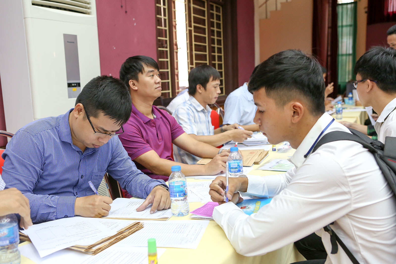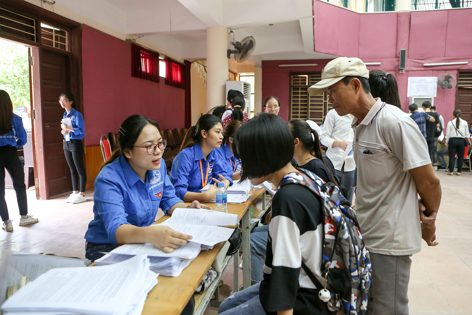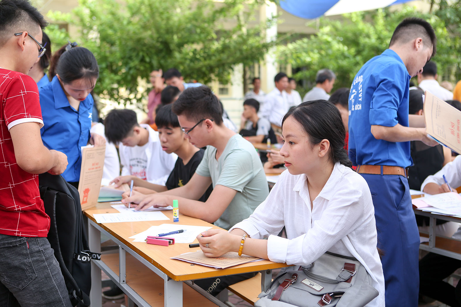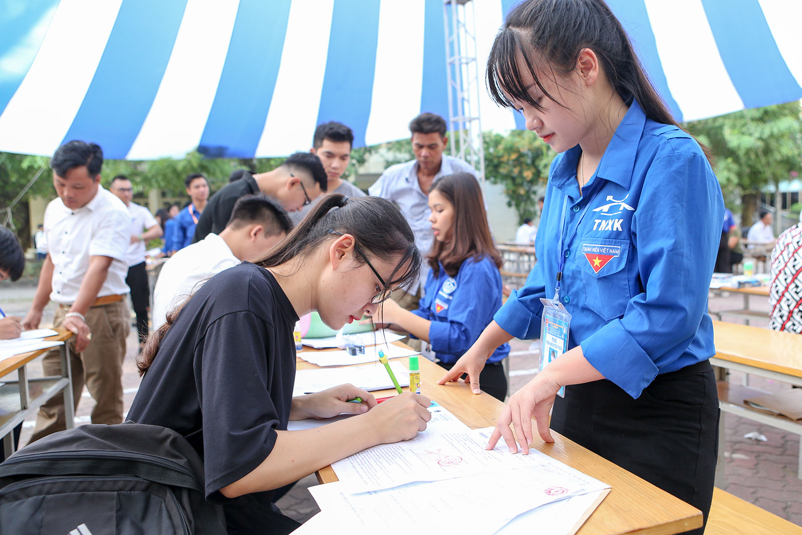 Các tân sinh viên K70 được các anh chị sinh viên tình nguyện khoá trên hướng dẫn khai hồ sơ rất cụ thể