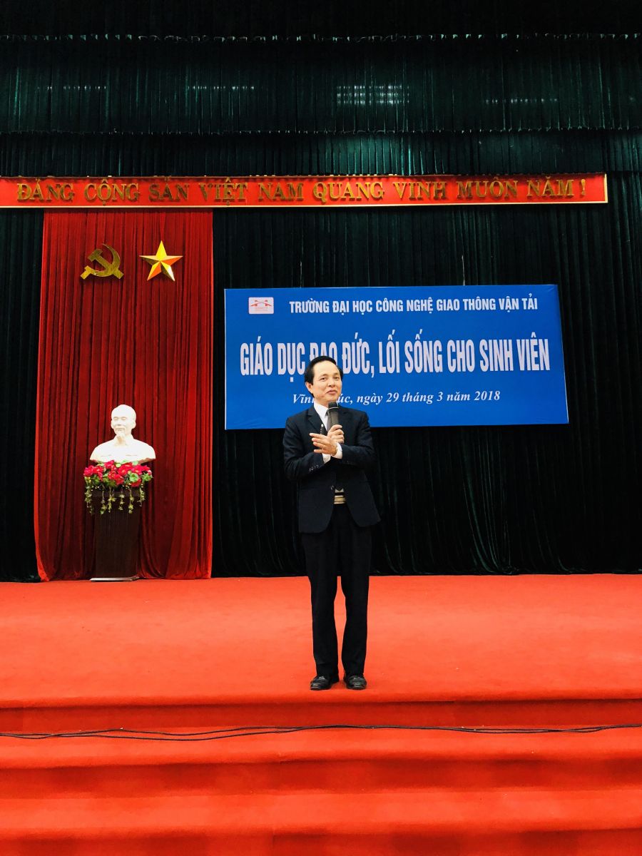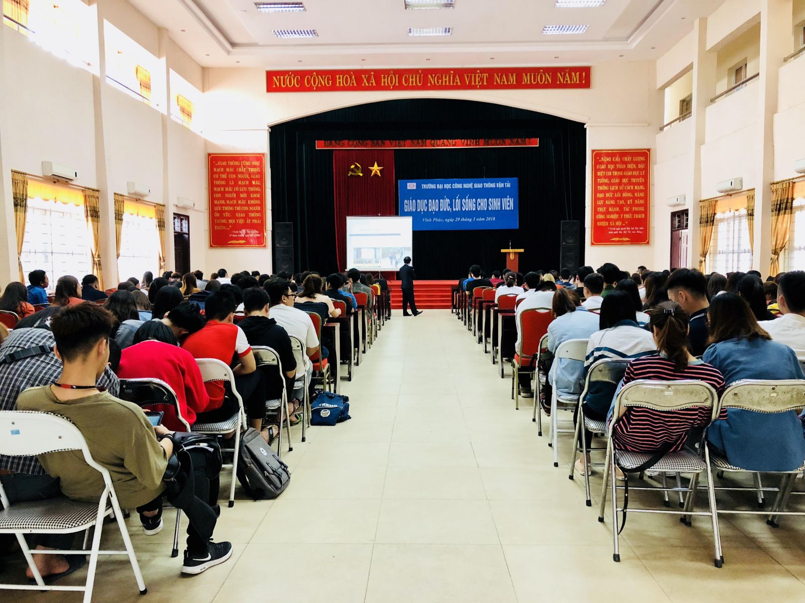 Sáng ngày 29/3/2018, tại Hội trường lớn Cơ sở đào tạo Vĩnh Phúc, Trường Đại học Công nghệ GTVT tổ chức chuyên đề “Giáo dục tư tưởng, đạo đức, lối sống sinh viên”. Tới dự chương trình, về phía khách mời có PGS. TS. Nguyễn Quang Liệu – Trưởng phòng Công tác sinh viên, Đại học Quốc gia Hà Nội; về phía Trường Đại học Công nghệ GTVT có TS. Vương Văn Sơn – Phó trưởng phòng Đào tạo, phụ trách Cơ sở Vĩnh Phúc, lãnh đạo các phòng, ban, khoa, trung tâm; GVCN và các cán bộ lớp, bí thư đoàn các lớp sinh viên tới tham dự.