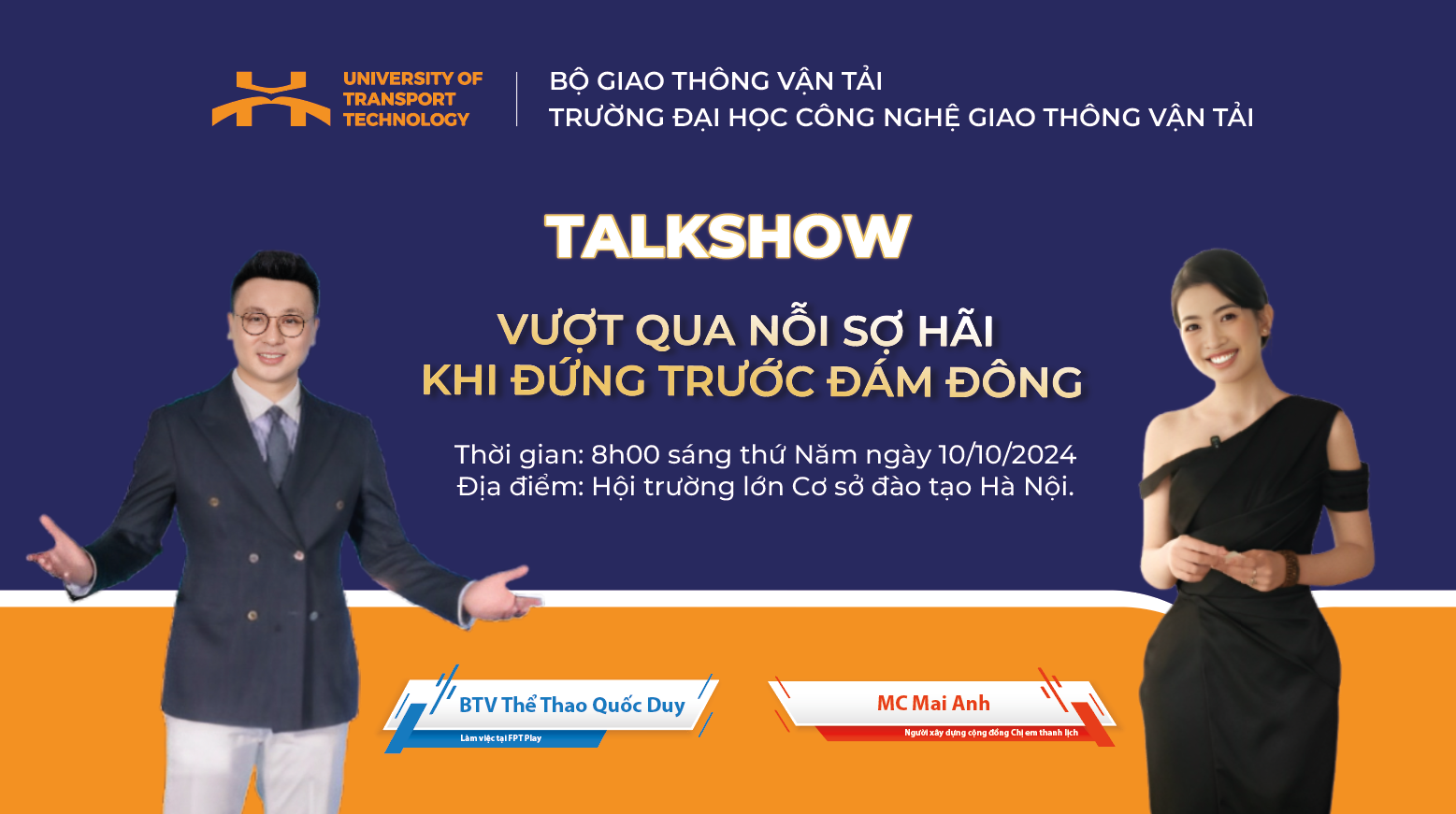 Thực hiện chương trình công tác sinh viên năm học 2024 – 2025, Trường Đại học Công nghệ Giao thông vận tải xây dựng kế hoạch tổ chức talkshow “Vượt qua nỗi sợ hãi khi đứng trước đám đông”, nội dung cụ thể như sau: