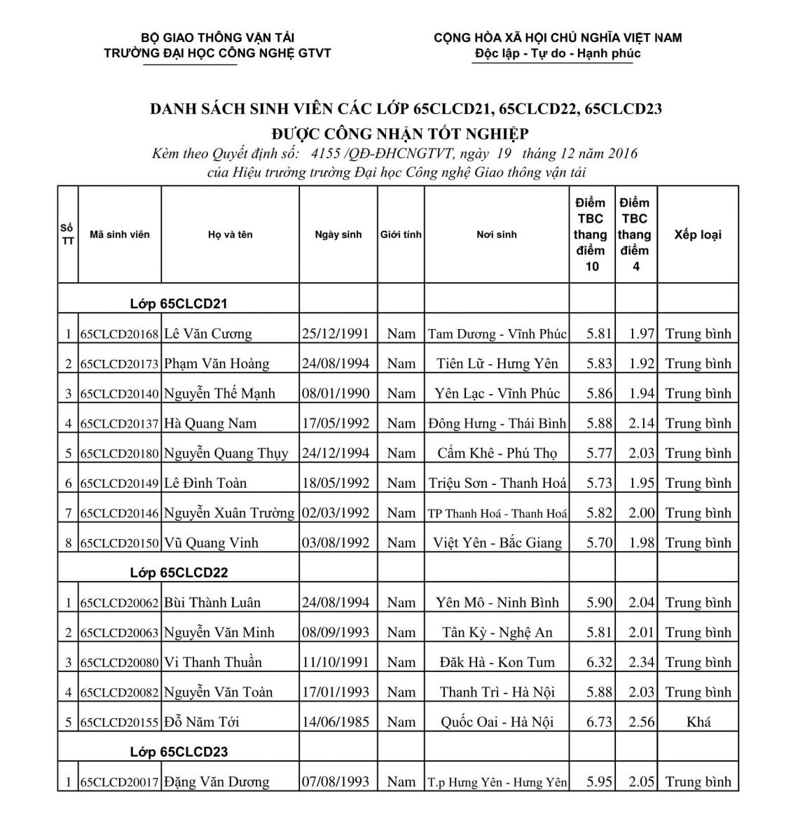 Danh sách sinh viên các lớp 65CLCD21, 65CLCD22, 65CLCD23 được công nhận tốt nghiệp