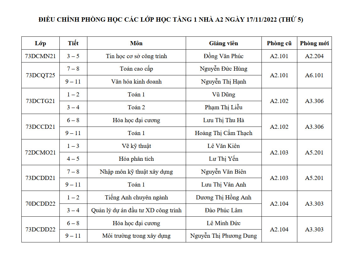 Ngày 17/11/2022, phòng học của các lớp học tại tầng 1 nhà A2 - CSĐT Hà Nội được điều chỉnh (chi tiết xem thông tin bên dưới).