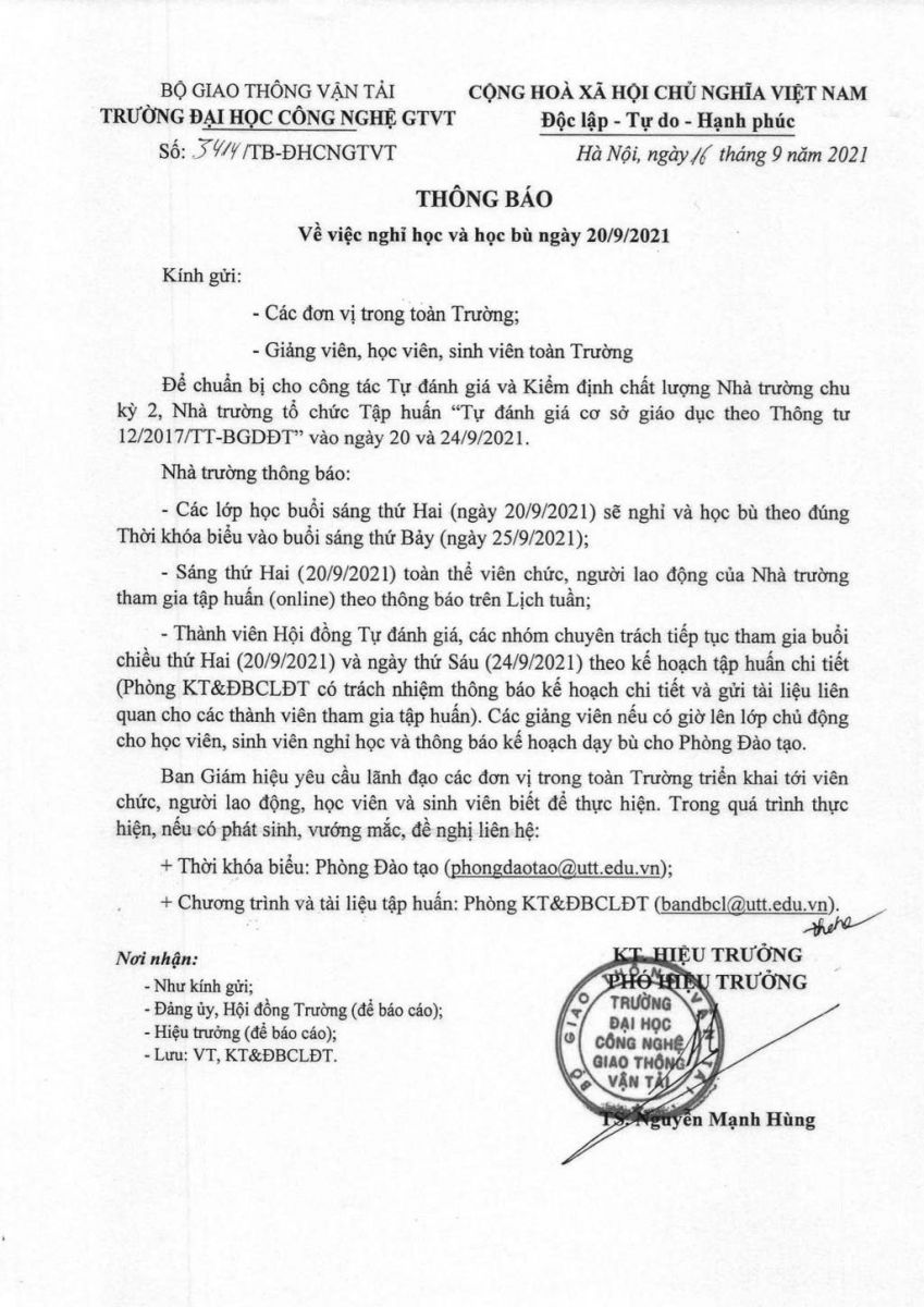 Thông báo về việc nghỉ học và học bù ngày 20/9/2021