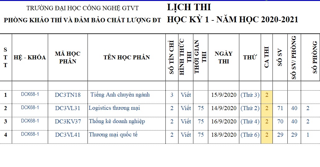 Lịch thi học kỳ 1 năm 2020-2021 - Lớp 68DCTN và 68DCVL