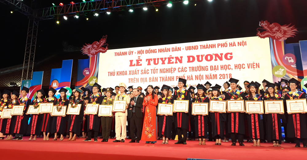 Tối 8/10, tại Văn Miếu Quốc Tử Giám, Thành ủy, HĐND, UBND TP Hà Nội tổ chức lễ tuyên dương 88 thủ khoa xuất sắc tốt nghiệp các trường đại học (ĐH), học viện trên địa bàn TP Hà Nội năm 2018. Tới dự lễ tuyên dương có Ủy viên Bộ Chính trị, Bí thư Thành ủy Hoàng Trung Hải; Trưởng ban Tuyên giáo Thành ủy Hà Nội Nguyễn Văn Phong; Trưởng ban Dân vận Thành ủy Nguyễn Lan Hương; Phó Chủ tịch HĐND TP Phùng Thị Hồng Hà; Phó Chủ tịch UBND TP Ngô Văn Quý. cùng lãnh đạo đại diện các Bộ, Ban, ngành, các tổ chức chính trị xã hội của Trung ương; đại diện lãnh đạo các ban Đảng Thành uỷ, Hội đồng nhân dân, Uỷ ban nhân dân; lãnh đạo các sở, ban, ngành, tổ chức chính trị xã hội Thành phố; lãnh đạo các quận, huyện, thị xã; các cơ quan và Đảng bộ trực thuộc Thành phố Hà Nội; Thường trực Thành đoàn Hà Nội, đại diện Đảng ủy – Ban Giám hiệu, Ban Giám đốc các trường đại học, học viện. Năm 2018 là năm thứ 16 thành phố Hà Nội tổ chức tuyên dương thủ khoa xuất sắc tốt nghiệp các trường đại học, học viện trên địa bàn. Đây là hoạt động thể hiện sự quan tâm thường xuyên, sâu sắc của thành phố Hà Nội đối với sự nghiệp giáo dục, đào tạo, bồi dưỡng thế hệ trẻ; đồng thời ghi nhận, biểu dương đối với kết quả học tập, rèn luyện, tinh thần vượt khó vươn lên của sinh viên Thủ đô. 88 thủ khoa xuất sắc năm 2018 được ghi danh là những tấm gương tiêu biểu của sinh viên Thủ đô trong học tập và rèn luyện. Nhiều thủ khoa xuất sắc là đảng viên (47 thủ khoa), là những tấm gương vượt khó vươn lên, có công trình nghiên cứu khoa học, đề tài, sáng kiến, giải pháp thiết thực, hiệu quả được giải thưởng trong nước và quốc tế; nhiều bạn là cán bộ Đoàn, Hội tích cực, năng động...