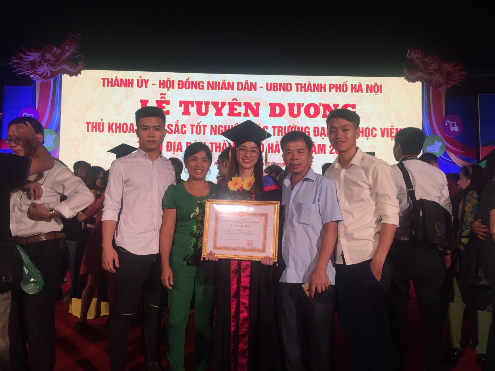 Thủ khoa Phạm Thị Nhung chụp ảnh cùng gia đình và các bạn