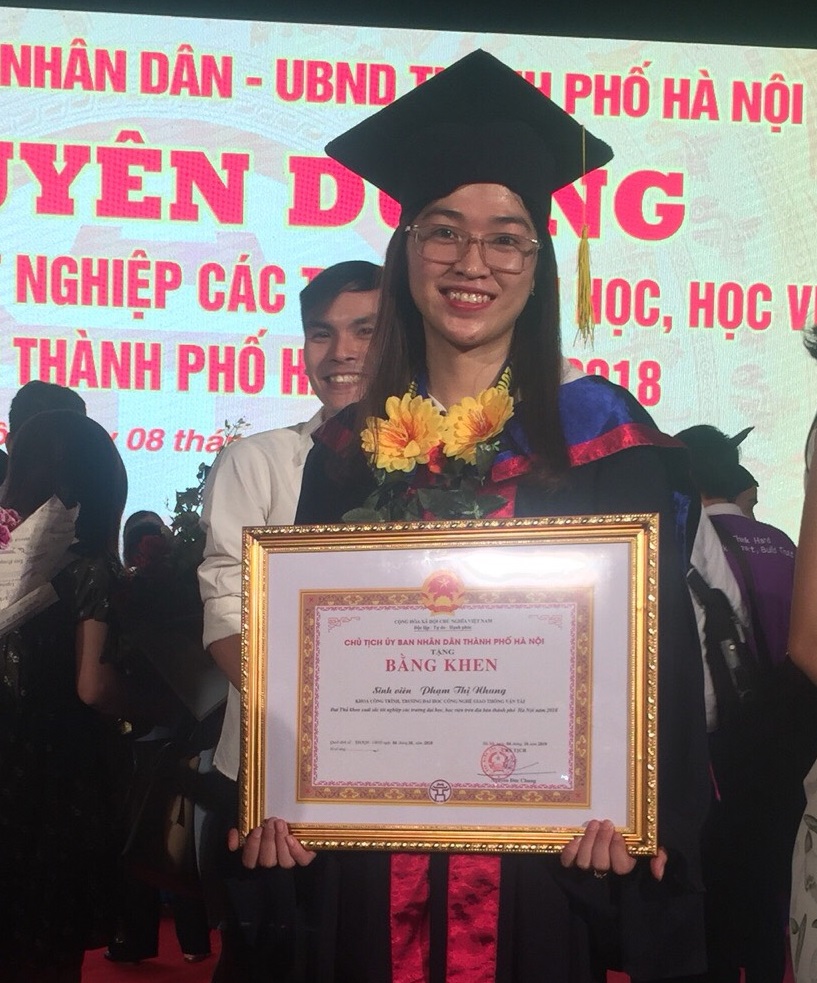 Sinh viên Phạm Thị Nhung, khoa Công trình, Trường Đại học Công nghệ Giao thông vận tải vinh dự là một trong 88 thủ khoa được thành Đoàn Hà Nội vinh danh. Phạm Thị Nhung có kết quả học tập xuất sắc 3,81 và kết quả rèn luyện là 93,3. Em sinh ra và lớn lên trong một gia đình làm nông tại huyện Giao Thủy, tỉnh Nam Định. Ngay từ thời THPT sinh viên Phạm Thị Nhung đã có mong muốn học tập tại Trường Đại học Công nghệ GTVT khối ngành công trình. Mặc dù là nữ sinh ngành công trình, nhưng Nhung đã thể hiện được sự nỗ lực, cố gắng không ngừng. Suốt 5 năm học tập, em đều đạt được kết quả học tập và rèn luyện xuất sắc, ngoài ra em còn đạt giải nhất Olympic môn cơ học đất cấp Trường năm 2016, giải khuyến khích Olympic Cơ học toàn quốc môn Cơ học đất năm 2016, đạt được học bổng chắp cánh ước mơ tiếp bước giảng đường năm 2015, học bổng FUYO của Nhật Bản lần thứ 18. Bên cạnh đó Phạm Thị nhung cũng tham gia tích cực các hoạt động do Đoàn Thanh niên – Hội Sinh viên Trường tổ chức, ngay từ năm thứ 3 Đại học, Phạm Thị Nhung đã được vinh dự đứng trong hàng ngũ của Đảng, ngoài ra 5 năm là sinh viên tình nguyện và có thêm những trải nghiệm, kĩ năng để hoàn thiện bản thân mình và đã được nhận giấy khen vì những thành tích xuất sắc trong công tác Đoàn và phong trào thanh niên Trường ĐH Công nghệ GTVT, giấy khen của UBND huyện Cẩm Khê năm 2015, giấy khen của UBND xã Văn Quán năm 2014 vì những thành tích xuất sắc trong chiến dịch tình nguyện “Mùa hè xanh”…