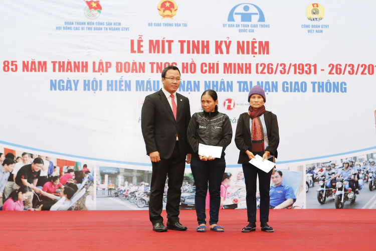 Đ/c Khuất Việt Hùng - Phó Chủ tịch chuyên trách Ủy ban ATGT Quốc gia và đồng chí Nguyễn Thị Thu Thủy – Phó Chủ tịch Công đoàn GTVTVN tặng quà, động viên thanh niên có thành tích xuất sắc tham gia hoạt động hiến máu nhân đạo