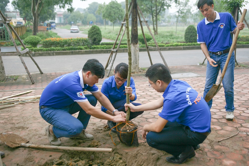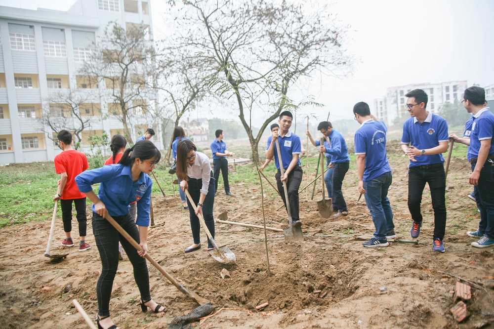 Hình ảnh các đoàn viên thanh niên trồng cây trong khuôn viên Trường.