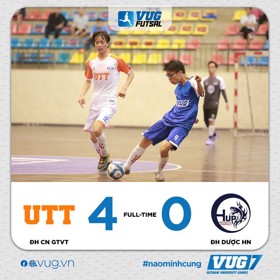 Không khó cho Đội tuyển futsal Trường Đại học Công nghệ Giao thông vận tải để nhận được 3 điểm trong ngày đầu ra quân tại Giải thể thao sinh viên Việt Nam năm học 2018 - 2019. Đại học Dược Hà Nội là một đội chơi có ý tưởng, nhưng trước một Đại học Công nghệ Giao thông vận tải với kỹ năng và lối chơi chắc chắn, những ý tưởng của các cầu thủ Đại học Dược Hà Nội đã không thể triển khai thành công. Ngay từ Hiệp 1, Quang Linh - cầu thủ mang số áo 12 của UTT đã xuất sắc ghi bàn thắng đầu tiên, để ngay sau đó, Đại học Dược Hà Nội đã chuyển sang chơi chiến thuật Power-play nhằm bổ xung cho hàng công, rút ngắn tỉ số trận đấu và mong muốn chuyển bại thành thắng.