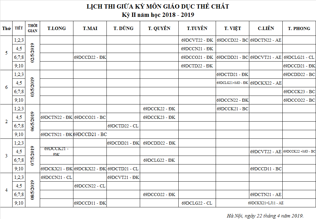 LỊCH THI MÔN HỌC GDTC KỲ II NĂM HỌC 2018-2019 ( CSĐT VĨNH PHÚC)