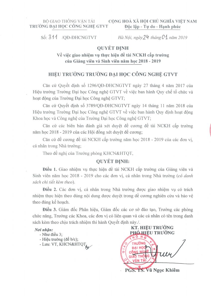 Quyết định giao nhiệm vụ thực hiện đề tài NCKH cấp trường của Giảng viên và Sinh viên năm học 2018-2019