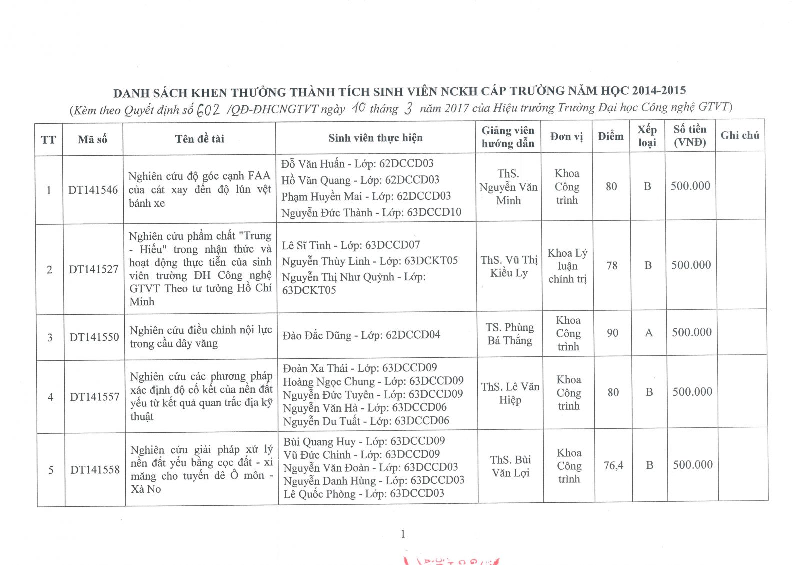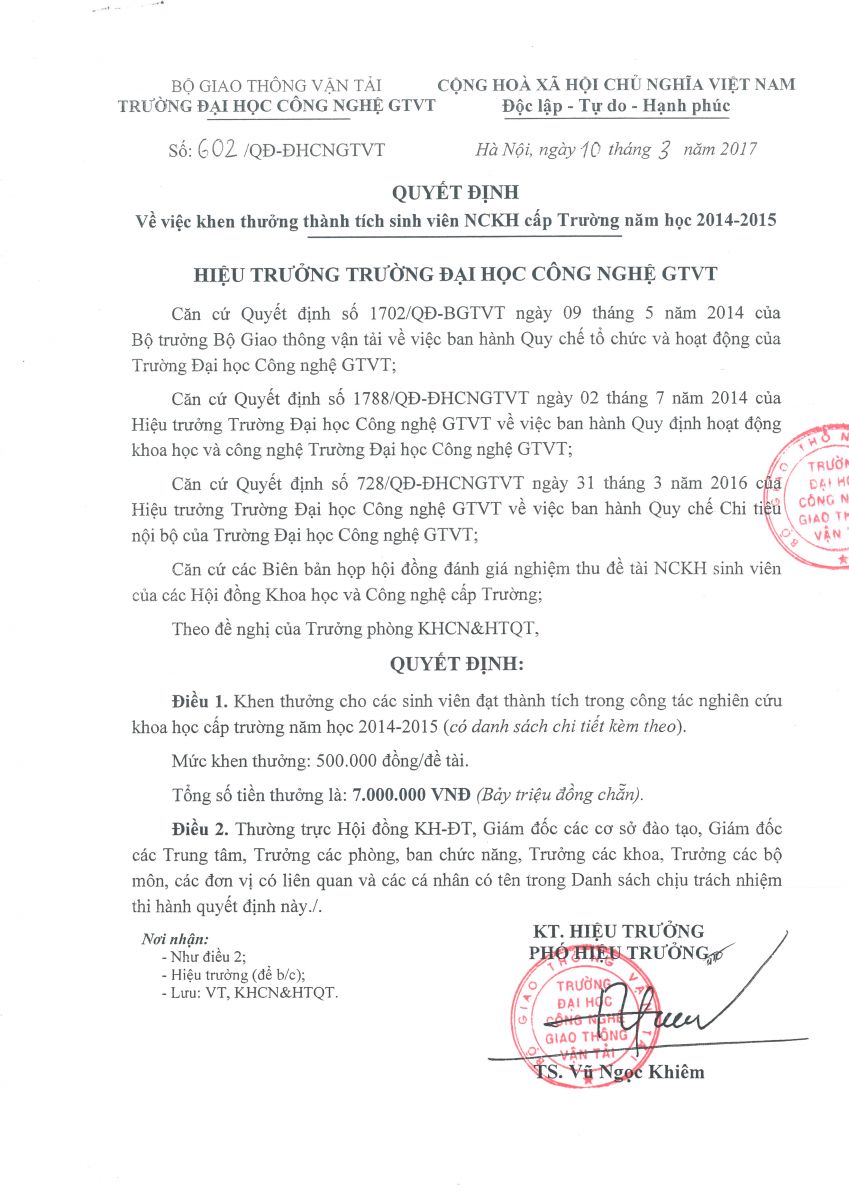 Quyết định khen thưởng thành tích sinh viên NCKH cấp Trường năm học 2015-2016 (đợt 1)