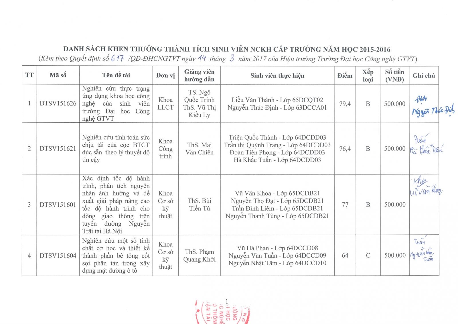 Quyết định khen thưởng thành tích sinh viên NCKH cấp Trường năm học 2015-2016 (đợt 1)