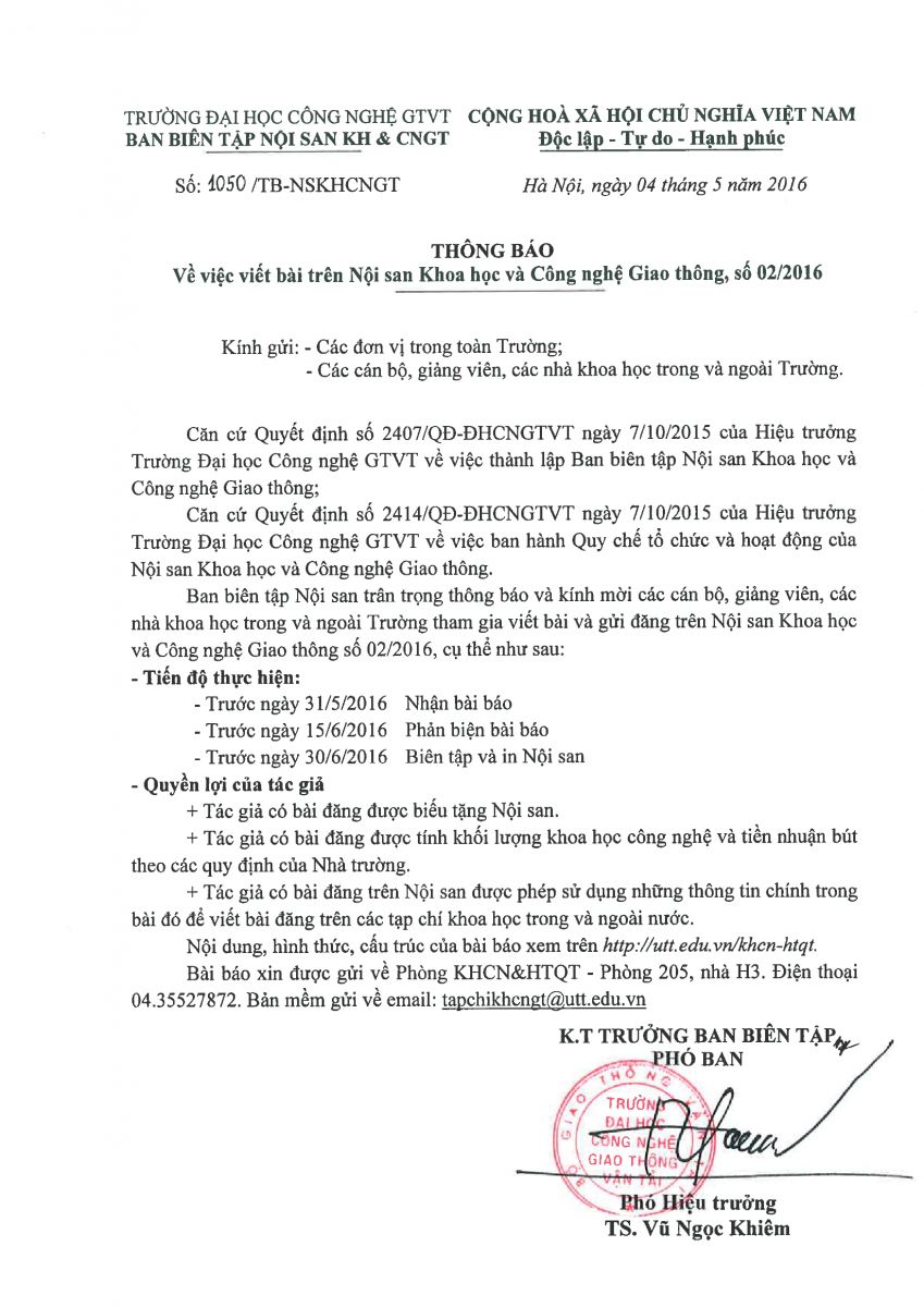 Thông báo viết Nội san Khoa học và Công nghệ Giao thông số 02/2016