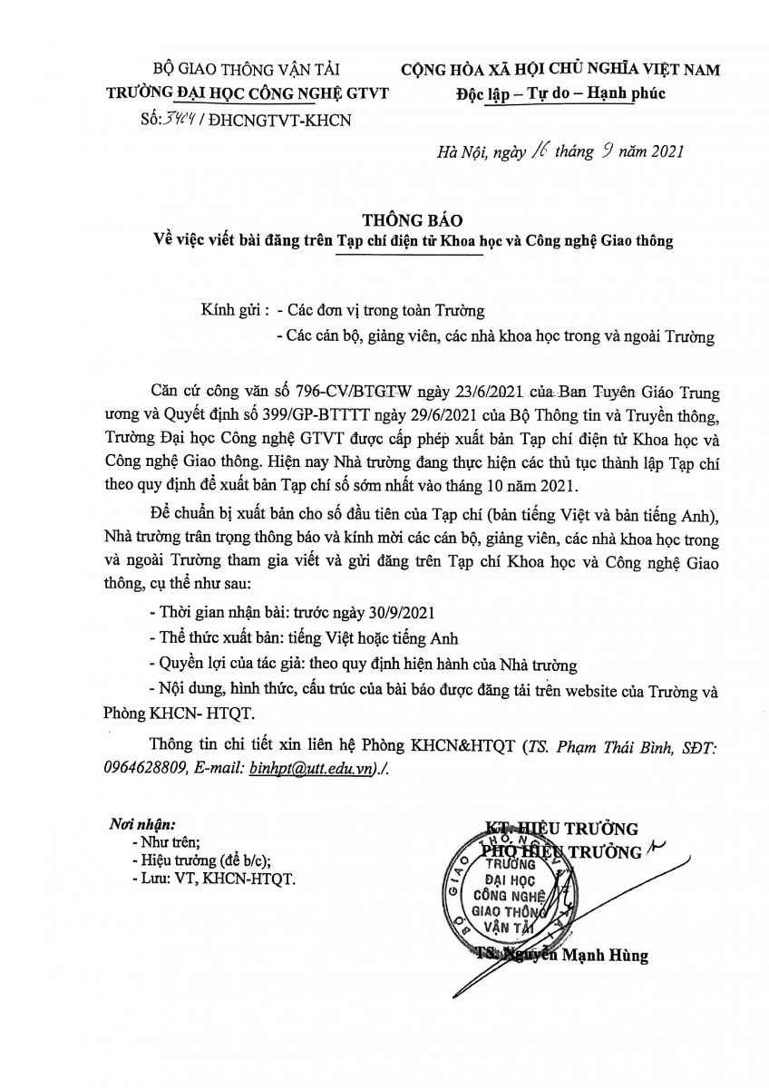 Thông báo về việc viết bài đăng trên Tạp chí điện tử Khoa học và Công nghệ giao thông