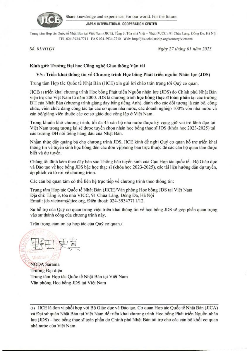 Cán bộ, giảng viên Trường Đại học Công nghệ GTVT nếu có nhu cầu vui lòng liên hệ đồng chí Hồ Sĩ Lành (ĐT: 0988 161 837 hoặc Email: lanhhs@utt.edu.vn), Phòng KHCN-HTQT để có thông tin chi tiết về chương trình. Thông báo chi tiết xem ở Tệp đính kèm./.