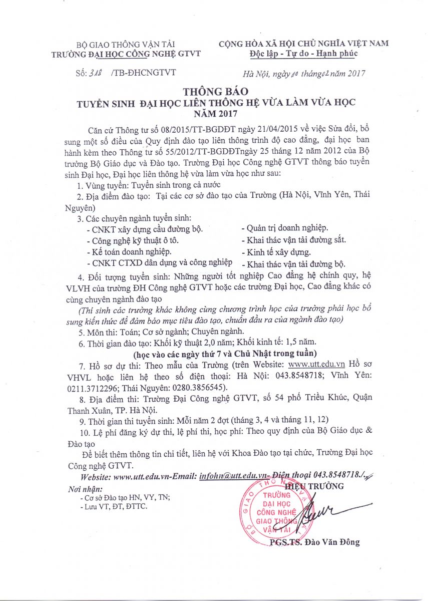 Thông báo tuyển sinh hệ Đại học liên thông hệ vừa làm vừa học năm 2017