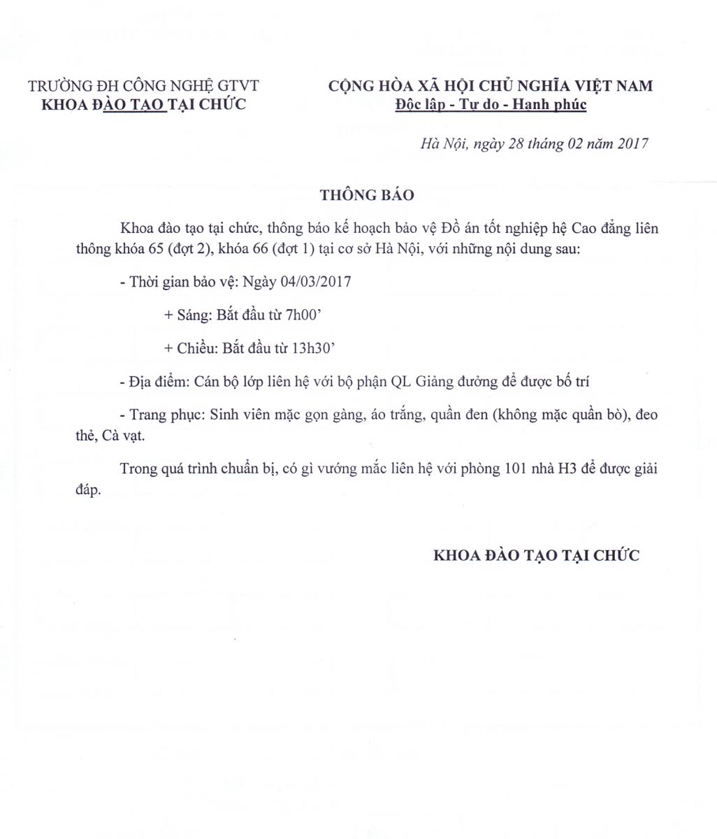 Thông báo kế hoạch bảo vệ Đồ án tốt nghiệp hệ Cao đẳng liên thông khóa 65 (đợt 2), khóa 66 (đợt 1) tại cơ sở Hà Nội