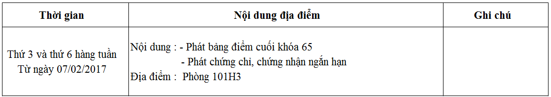 Thông báo về lịch cấp phát bảng điểm khóa 65; chứng chỉ, chứng nhận ngắn hạn