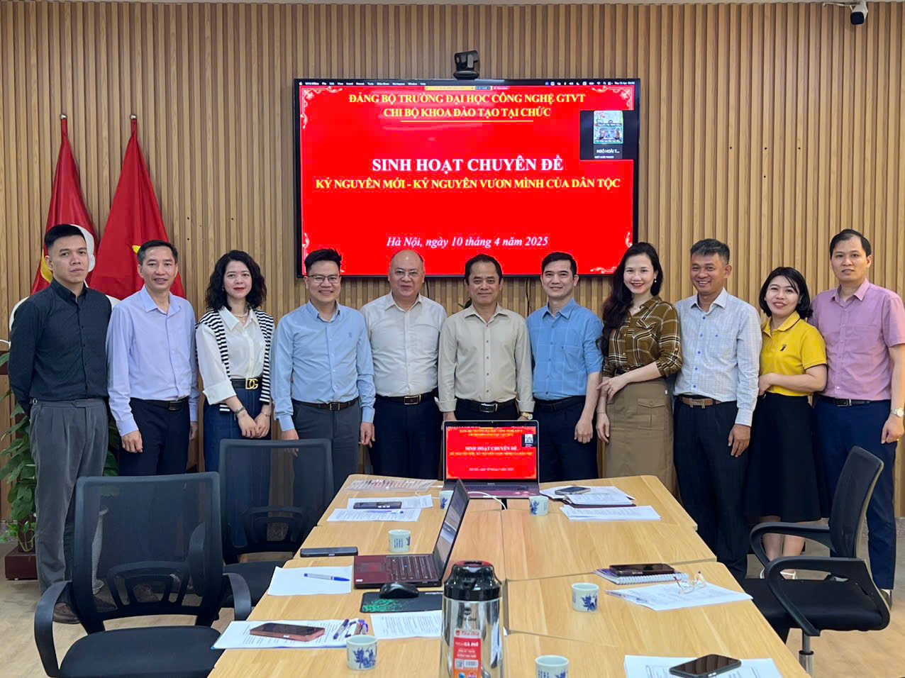 Tiếp tục thực hiện Kế hoạch công tác của Đảng ủy Trường Đại học Công nghệ Giao thông Vận tải về tổ chức sinh hoạt chuyên đề trong toàn Đảng bộ, ngày 10 tháng 4 năm 2025, Chi bộ Khoa Đào tạo tại chức đã tổ chức sinh hoạt chuyên đề: “Nghiên cứu, quán triệt, tuyên truyền tư tưởng chỉ đạo, định hướng lớn của Đảng và đồng chí Tổng Bí thư Tô Lâm về chuyển đổi số trong kỷ nguyên mới - kỷ nguyên vươn mình của dân tộc”.