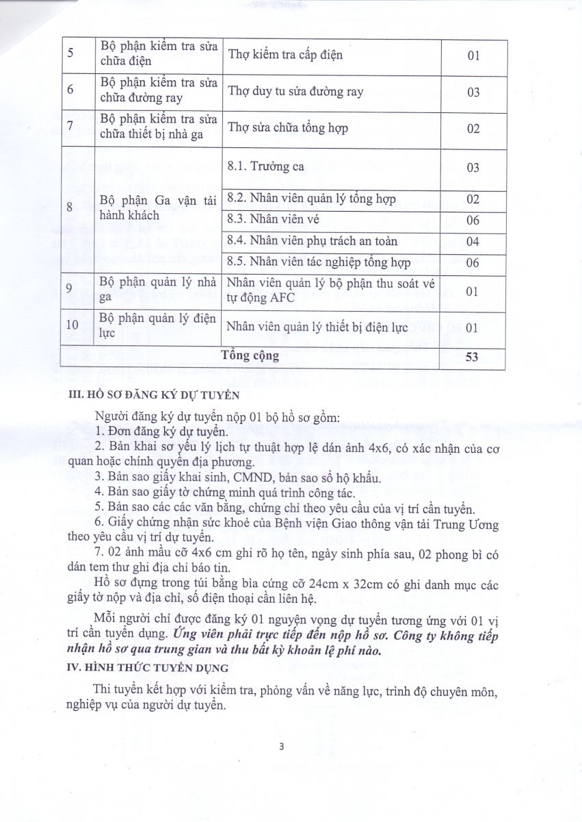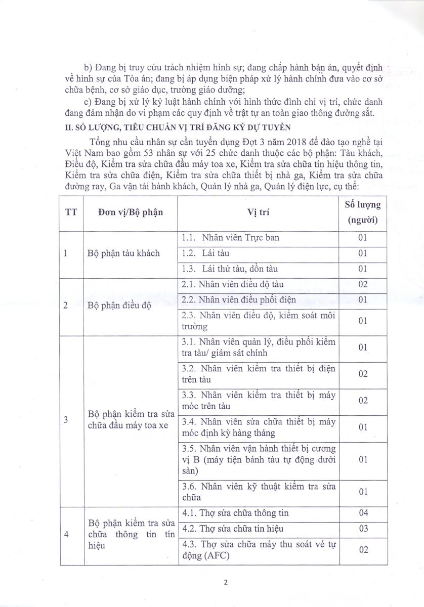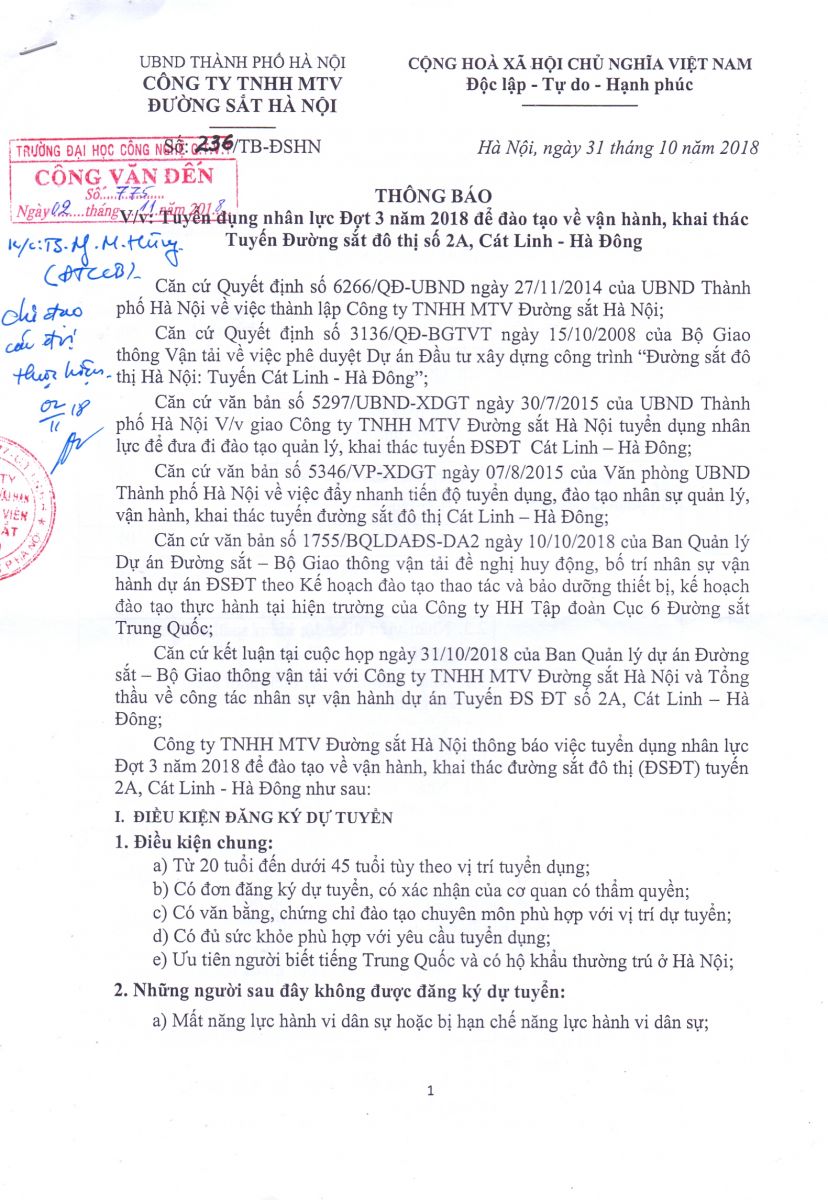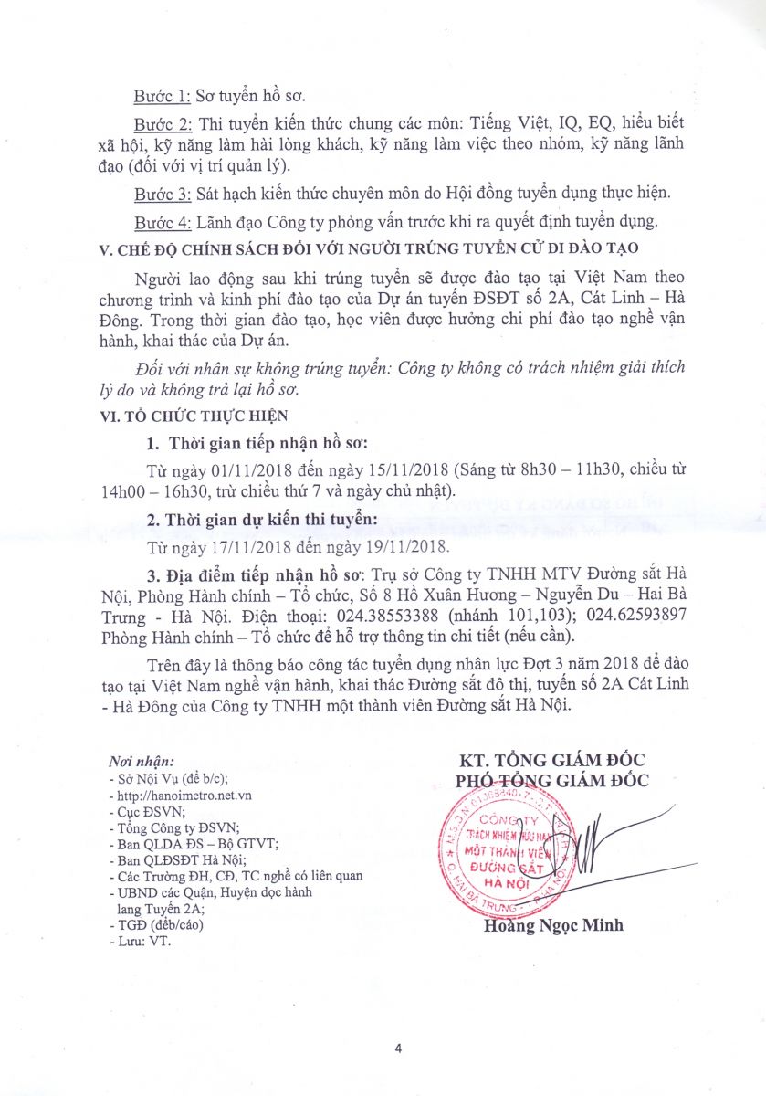 Thông báo tuyển dụng nhân lực đợt 3 năm 2018 để đào tạo về vận hành, khai thác tuyến đường sắt đô thị số 2A, Cát Linh - Hà Đông