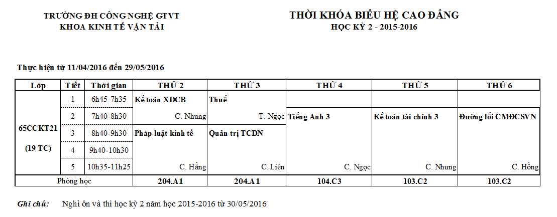 Để phục vụ công tác Bầu cử Quốc hội khóa XIV và Bầu cử Hội đồng nhân dân các cấp nhiệm kỳ 2016 - 2021, Phòng Đào tạo điều chỉnh phòng học của một số lớp bắt đầu từ ngày 11/4/2016. Vậy Khoa Kinh tế vận tải thông báo đến các thầy, cô giáo và các em sinh viên được biết để thực hiện. Phòng học điều chỉnh mới cụ thể như sau: