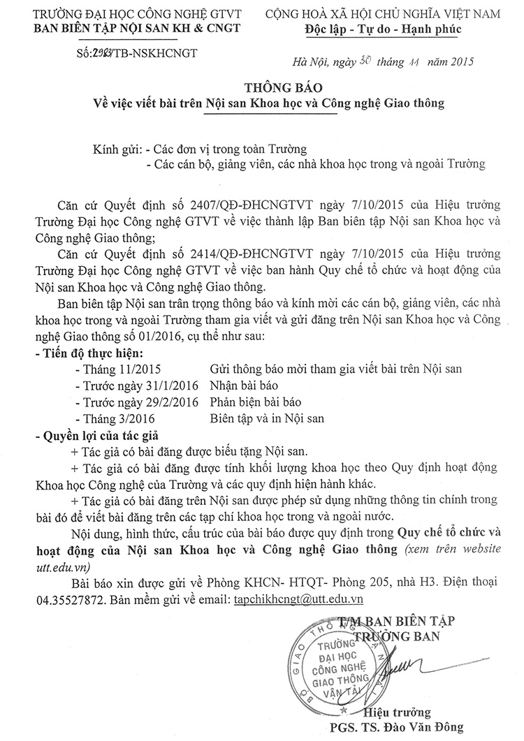 Thông báo viết bài trên Nội san Khoa học và Công nghệ Giao thông