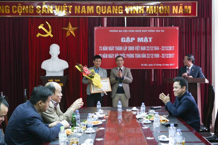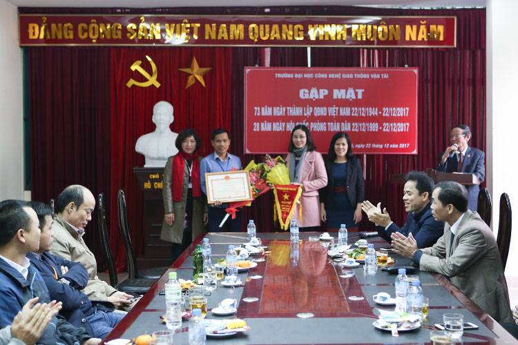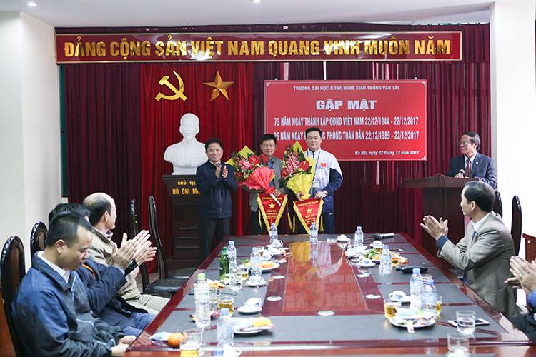 Trong không khí phấn khởi kỷ niệm 73 năm ngày thành lập Quân đội Nhân dân Việt Nam (22/12/1944); 28 năm ngày thành lập Quốc phòng toàn dân (22/12/1989), ngày 22/12/2017 được sự chỉ đạo của Ban chỉ huy quân sự cấp Quận Thanh Xuân (Hà Nội), Ban chỉ huy quân sự Trường Đại học Công nghệ Giao thông vận tải đã tiến hành kỷ niệm và gặp mặt những cựu chiến binh từng tham gia chiến đấu trên các chiến trường và trao thưởng cho các đồng chí trong Đội lực lượng Dân quân tự vệ, Sỹ quan dự bị, Thanh niên xung phong đạt thành tích xuất sắc trong các đợt Hội thao do Ban chỉ huy quân sự cấp quận tổ chức. Đ/c Dương Xuân Kỷ - Phó Chỉ huy trưởng thay mặt Ban chỉ huy quân sự Trường điểm lại những hoạt động chính và kết quả của công tác Quân sự trong năm 2017, như: Tham gia lễ ra quân huấn luyện và dự thi môn hình học cụ HLDQTV vào tháng 3, đạt giải 2 trên 80 đơn vị trong Quận; Tham gia huấn luyện cán bộ chỉ huy, huấn luyện tự vệ, tham gia tập luyện và hội thao chính trị; tham gia đào tạo SQDB, huấn luyện SQDB, hạ SQ, với các hoạt động trên đều đạt thành tích cao. Trong đó, đồng chí Vũ Đình Năm, Nguyễn Thị Thu – Khoa Lý luận chính trị, thuộc đội dân quân Tự vệ đã tham gia Hội thao chính trị cấp quận đạt giải nhì đồng đội; giải ba đồng đội về Hội thao chính trị của Bộ Tư lệnh thủ đô Hà Nội tổ chức và cá nhân đ/c Năm đạt giải nhì Hội thao chính trị cấp quận,…