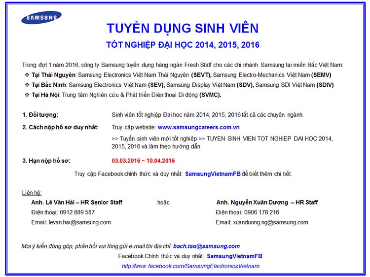# Cách nộp hồ sơ: 1. Truy cập: www.samsungcareers.com.vn 2. Vào mục: Tuyển dụng Sinh viên mới tốt nghiệp 3. Chọn công việc: TUYEN SINH VIEN TOT NGHIEP 2014, 2015, 2016 4. Điền thông tin theo hướng dân 5. Link FB hướng dẫn: https://www.facebook.com/SamsungElectronicsVietnam